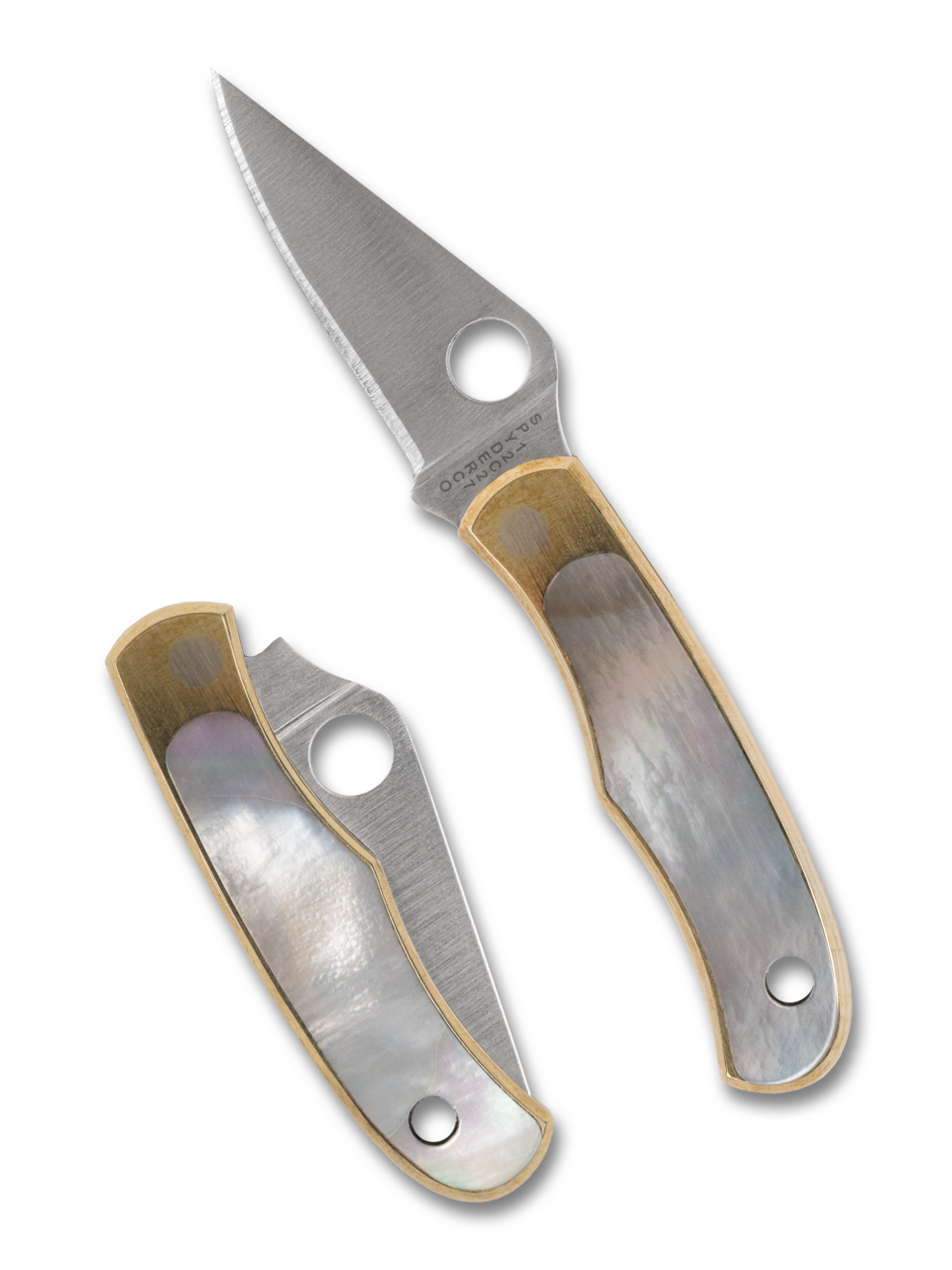 The latest rendition of our smallest folding knife, the Bug, makes a big statement with an upscaled format that includes nickel silver handle scales and genuine abalone inlays. The precision-machined scales feature an interframe design that completely encircles the abalone inlays for a flush, seamless fit. Their edges are also beautifully chamfered to further highlight their natural gold-colored tone. A stainless steel backspacer serves as the backbone of the knife’s slipjoint mechanism and supports the razor-sharp, full-flat-ground blade, which is crafted from 12C27 stainless steel. Proudly showcasing jewelry-quality craftsmanship, this Bug sets a new standard in Spyderco style.