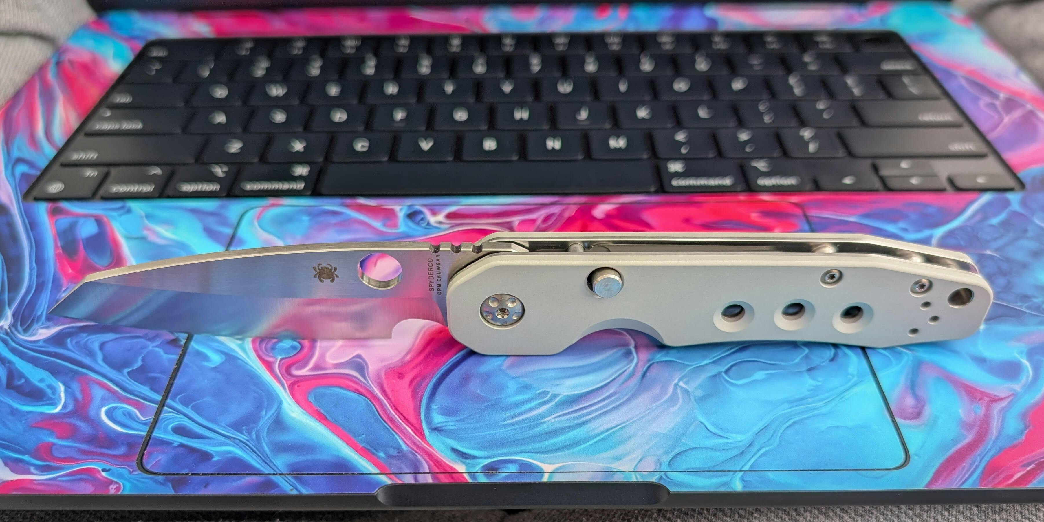The CruWear blade is sharp enough to shave arm hair with and comes to an acute tip which is similarly needle sharp. The whole thing is just one of the best Spydercos that I've seen straight out of the box.