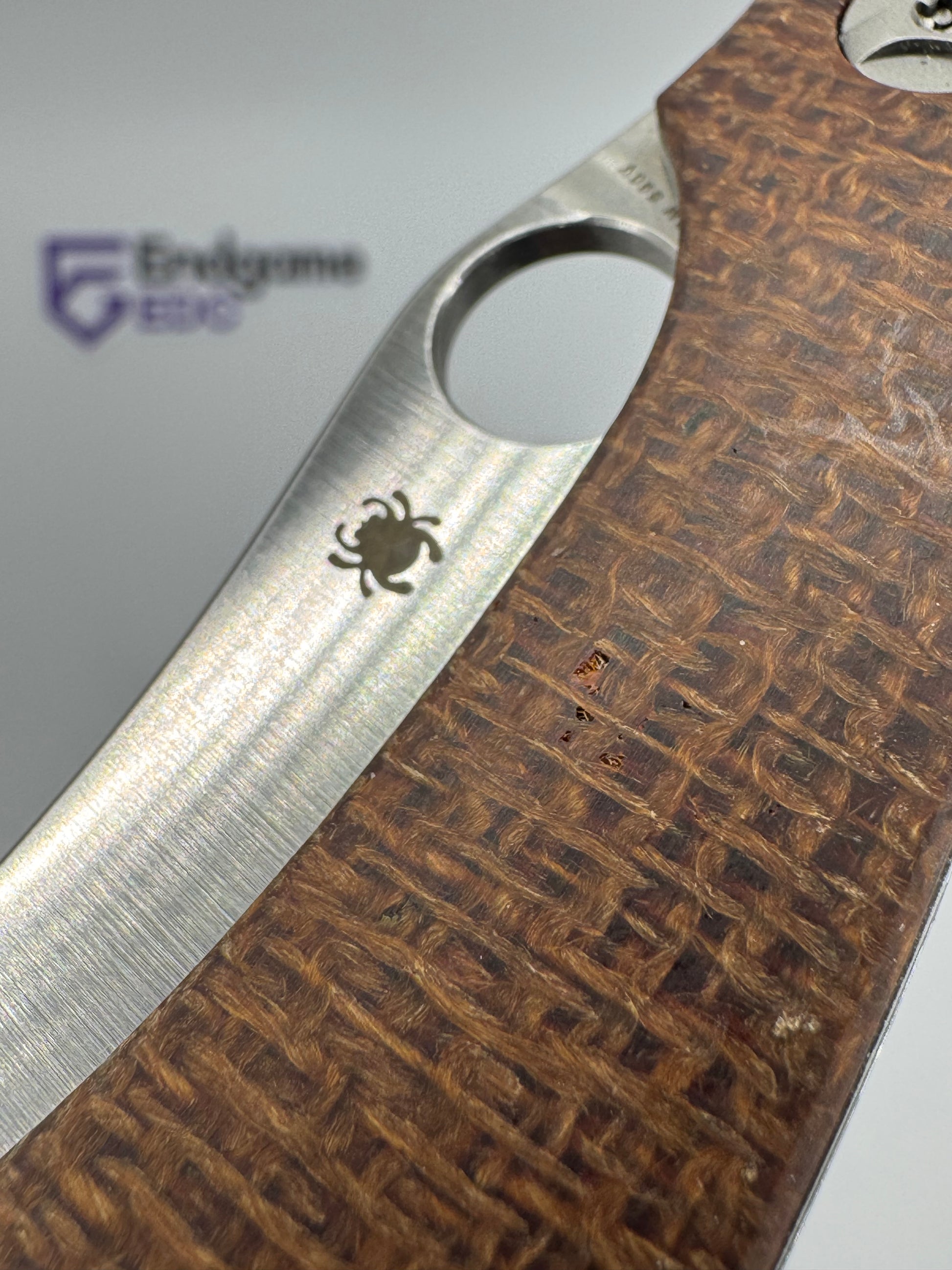 - "sticker shadow" - faint stain of the ID sticker that Spyderco put on the knife. We have done our best to clean each blade, but unfortunately were unable to remove it in some cases.