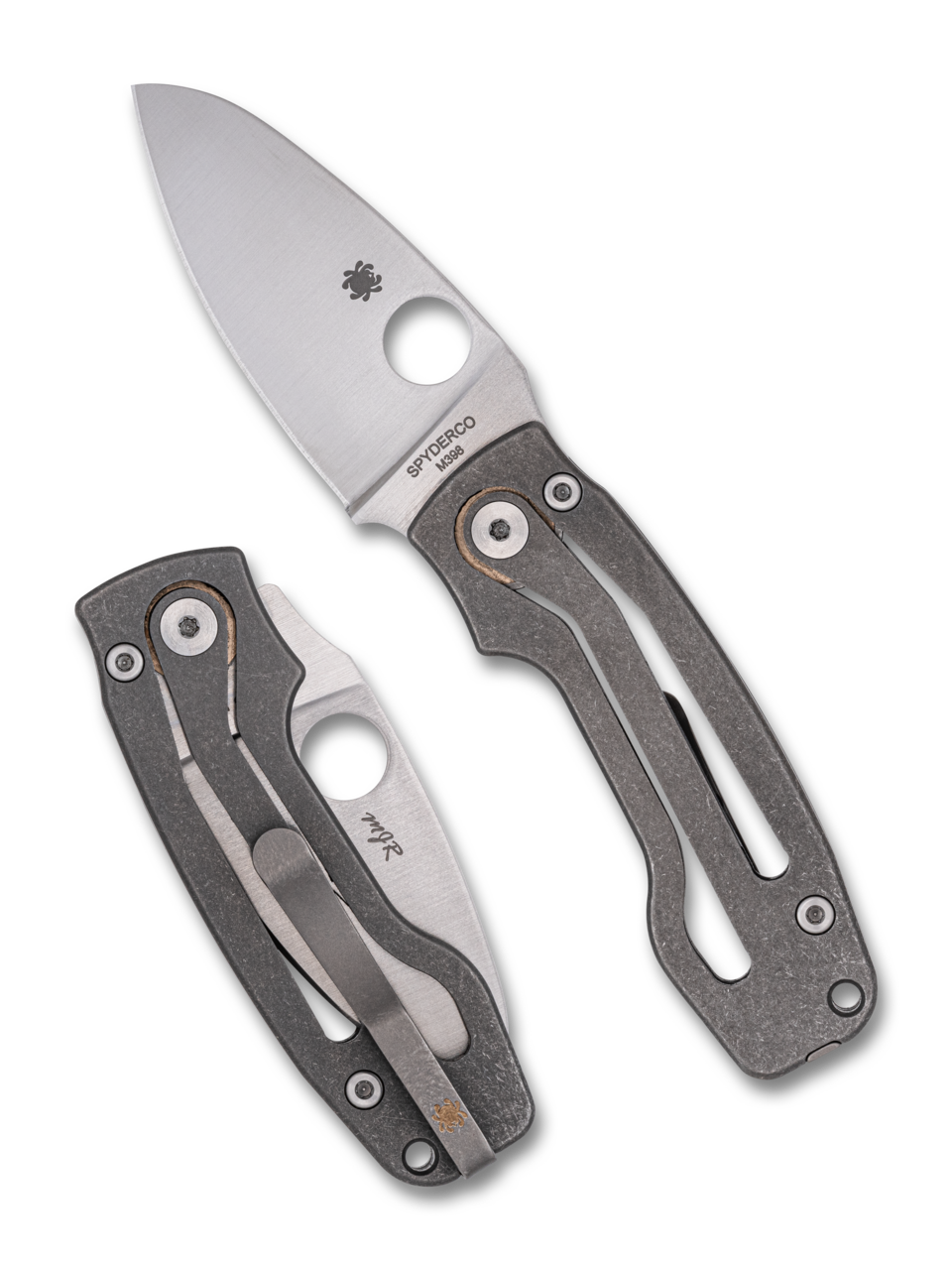 British knifemaker Mike Read specializes in crafting state-of-the-art non-locking folding knives. His first Spyderco collaboration, the PITS™ (short for “Pie in the Sky”—Read’s forum name on British knife forums), redefined the form of this genre. The PITS 2 takes that evolution a step further with a truly unique non-locking mechanism that consists of two integral spring arms machined into the handle scales. The forward end of these arms, which supports the blade pivot, flexes as the blade is opened to provide pressure for its notched-joint mechanism to bear against the stop pin. Meticulously machined from solid 6AL-4V titanium, the matte-finished handle scales are paired with a full-flat-ground, satin-finished blade crafted from Böhler-Uddeholm’s M398 particle metallurgy stainless steel. A remarkable expression of Spyderco’s SLIPIT™ concept, the PITS 2’s symmetrical design is complemented by a fully accessible Trademark Round Hole in the blade and a reversible tip-up pocket clip to make every aspect of its carry and operation completely ambidextrous.