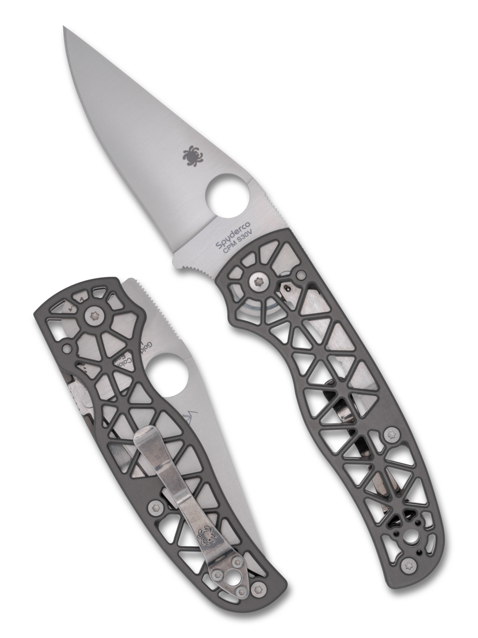 The brainchild of Spyderco co-founder Sal Glesser, the Edgerati™ translates his deep interest in high-performance sports cars into a remarkable knife design. Its pierced, geometric handle was inspired by the frame of the legendary “birdcage” Maserati, which revolutionized sports car design. True to that spirit, the Edgerati’s handle scales are painstakingly machined from solid aircraft-grade aluminum and hardcoat anodized to create an exceptional blend of strength, light weight, non-slip texture, and dramatic style. They also provide a view of the knife’s streamlined Compression Lock® mechanism, which consists of a stainless steel lock bar nested into a machined pocket in the obverse-side scale. The knife’s straight-spined, full-flat-ground blade is crafted from CPM® S30V® particle metallurgy stainless steel and features a textured index-finger choil that allows a forward-positioned grip for enhanced control. Its broad-based pocket clip is reversible for left or right-side tip-up carry and complements the blade’s fully accessible Trademark Round Hole™ to allow swift, positive deployment with either hand. The Edgerati is available with a satin-finished blade and brightly finished hardware and in an all-black configuration featuring a Diamond-Like Carbon (DLC) blade coating, black anodized scales, and a matching black-coated lock bar, clip, and hardware. Both finish options offer a choice of either a PlainEdge™ or fully serrated SpyderEdge™ blade.