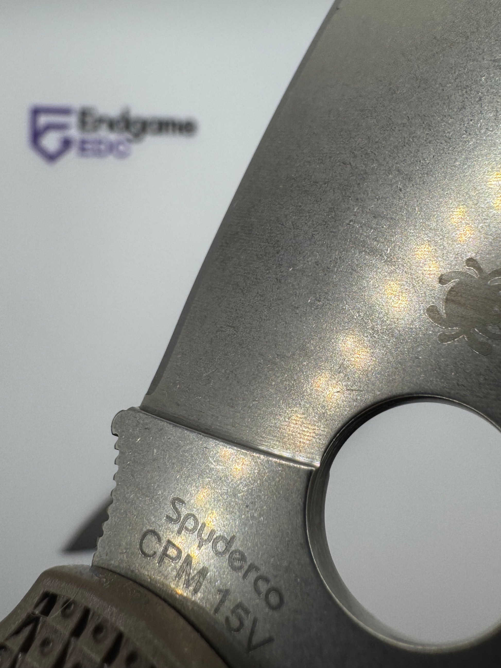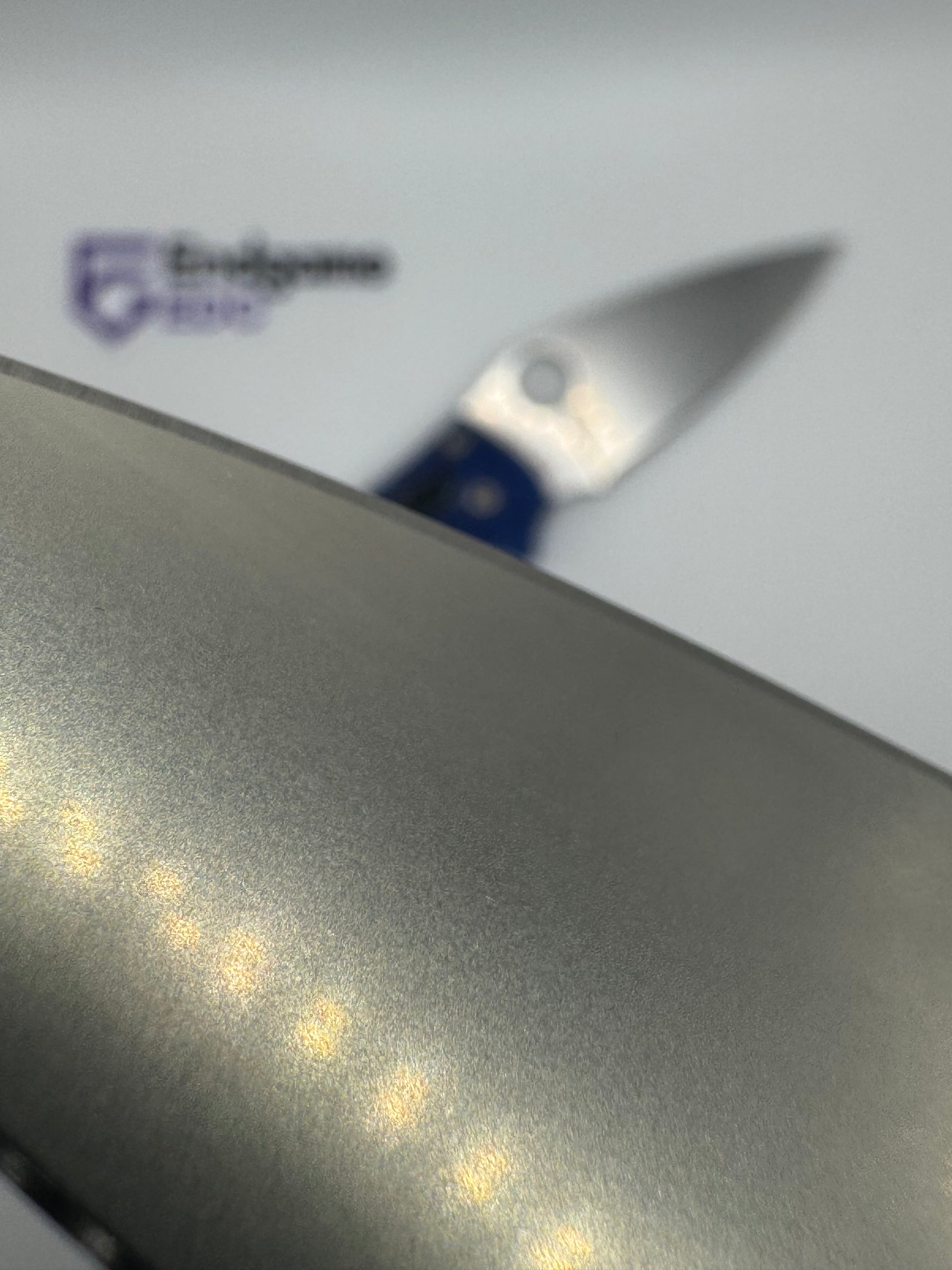 - "sticker shadow" - faint stain of the ID sticker that Spyderco put on the knife. We have done our best to clean each blade, but unfortunately were unable to remove it in some cases.