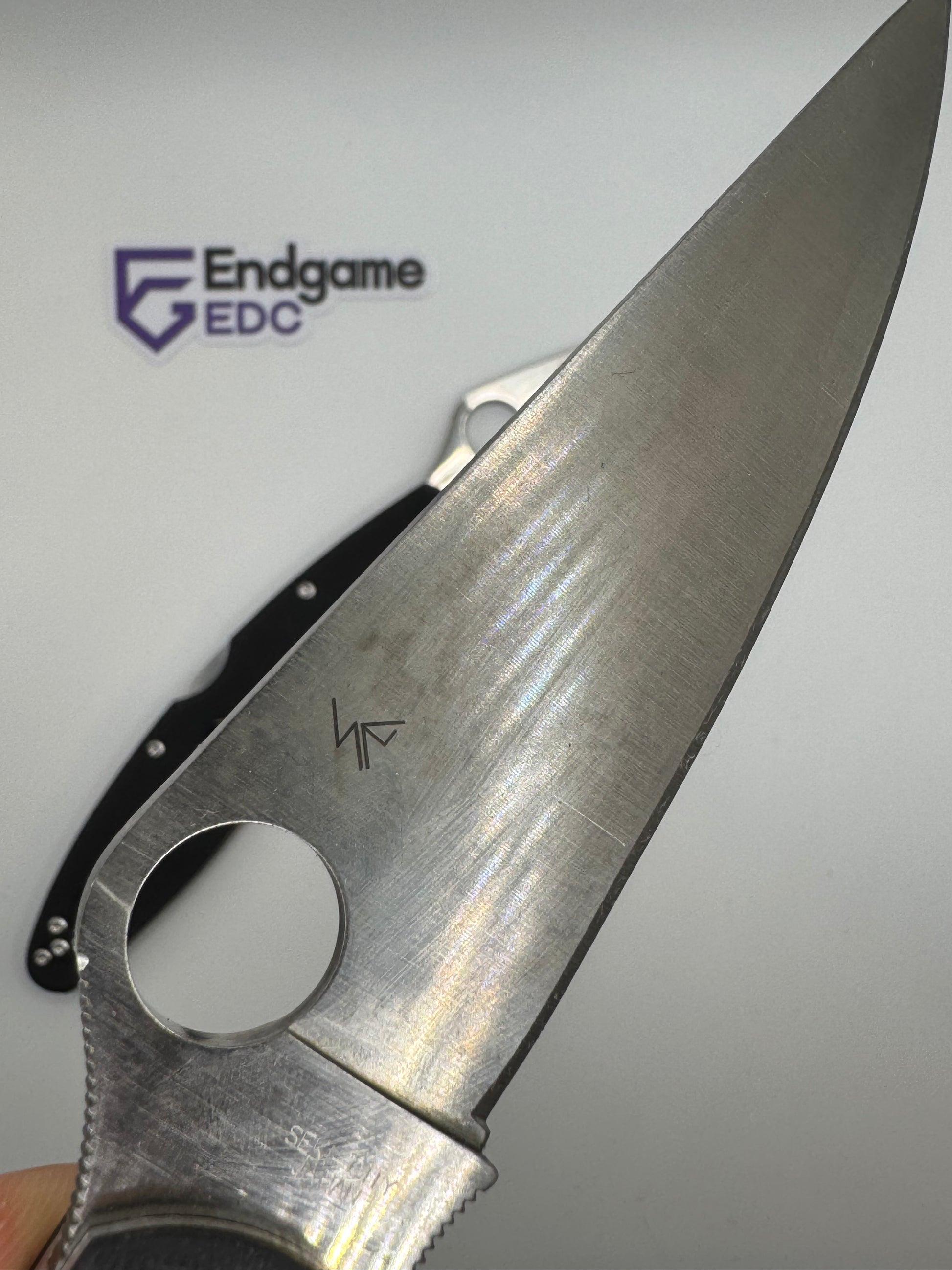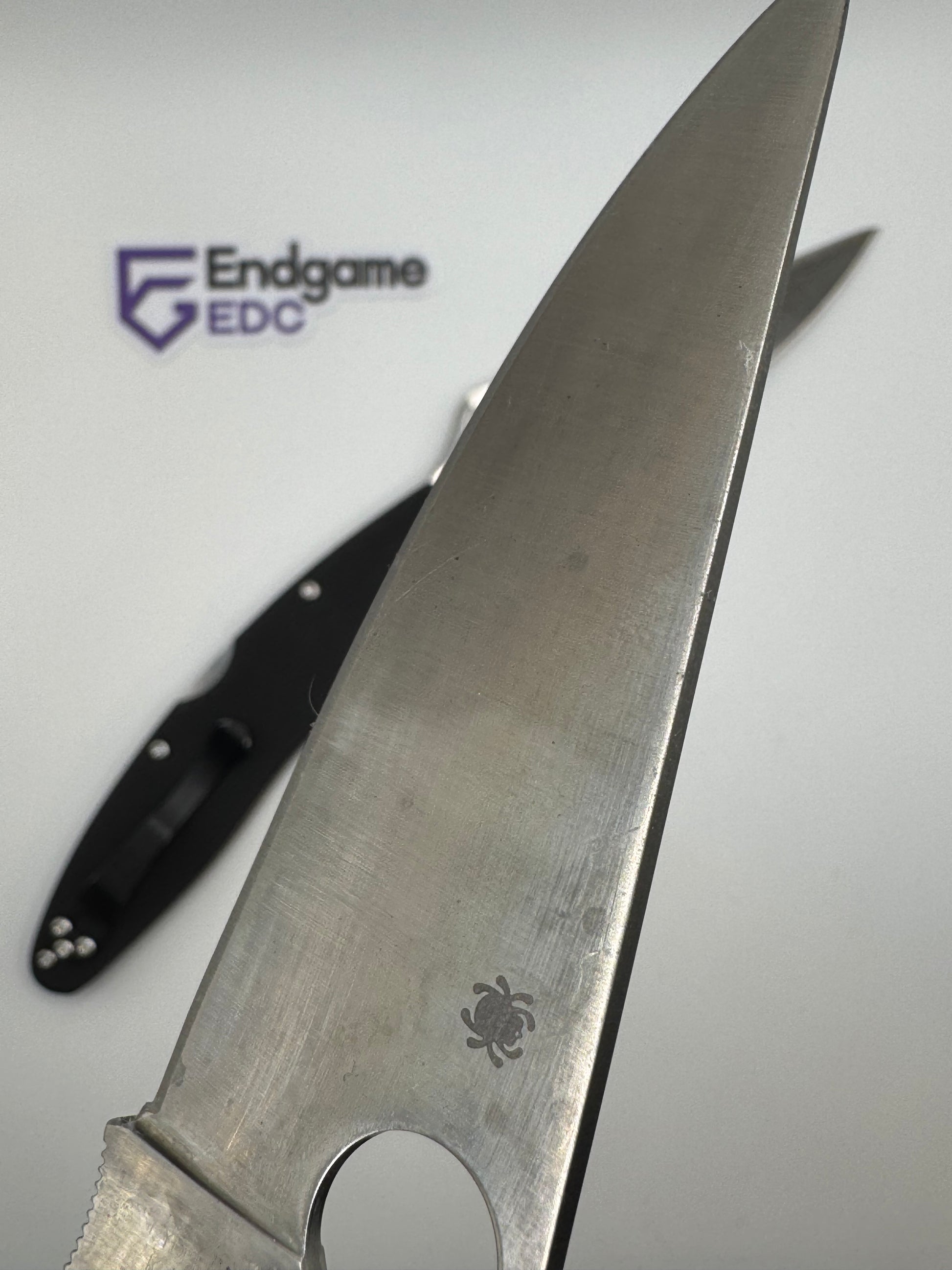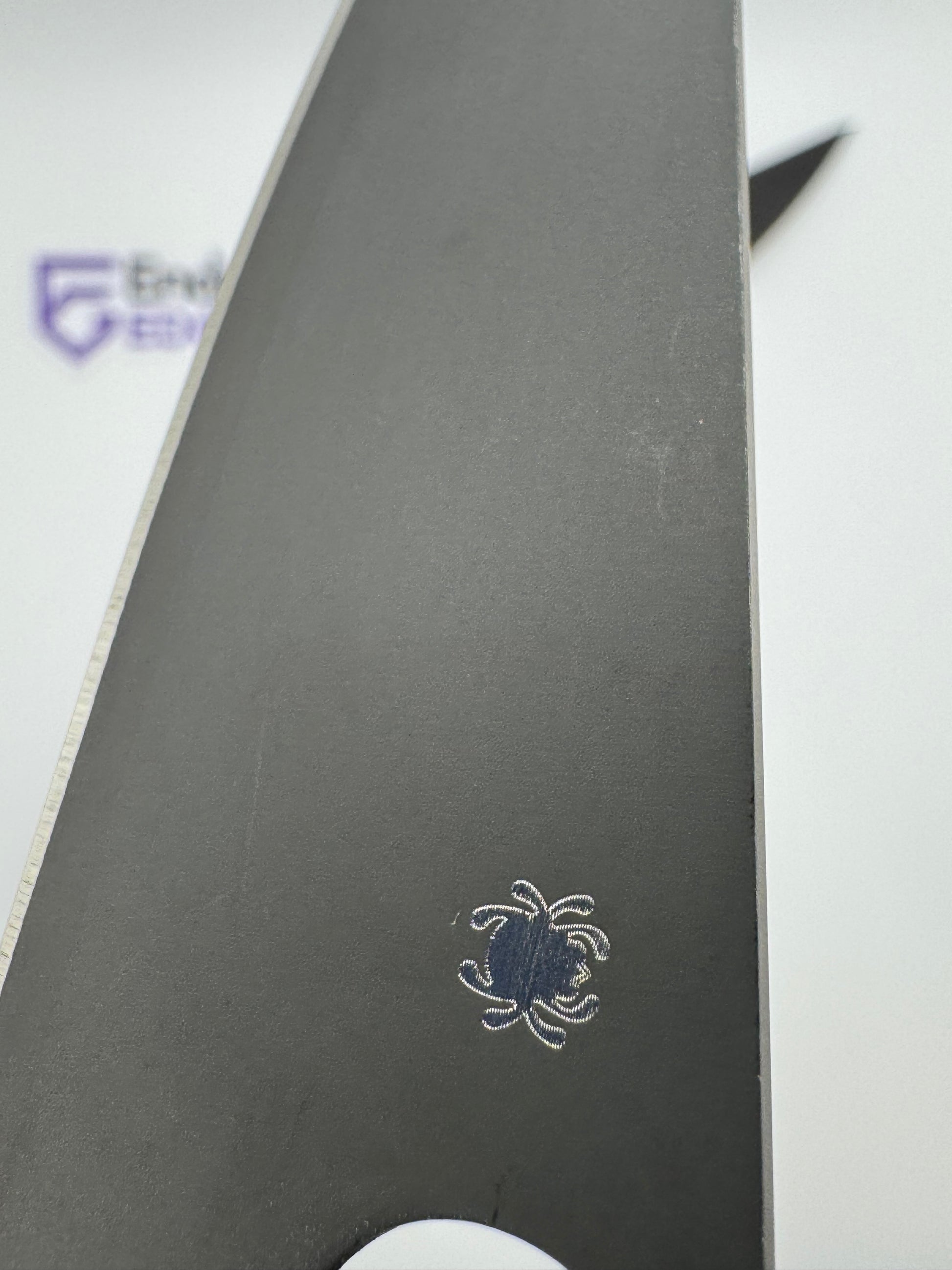 - "sticker shadow" - faint stain of the ID sticker that Spyderco put on the knife. We have done our best to clean each blade, but unfortunately were unable to remove it in some cases.