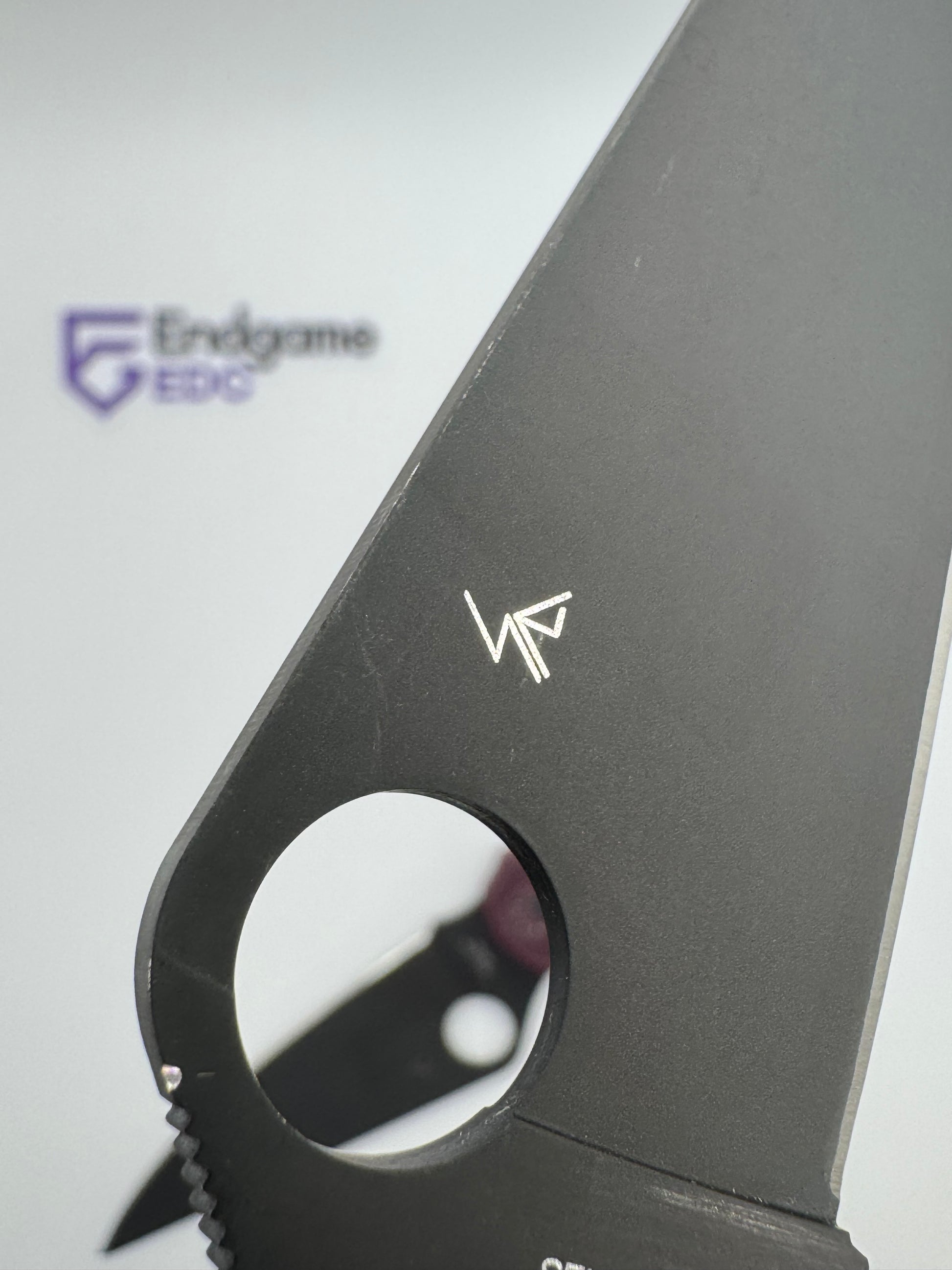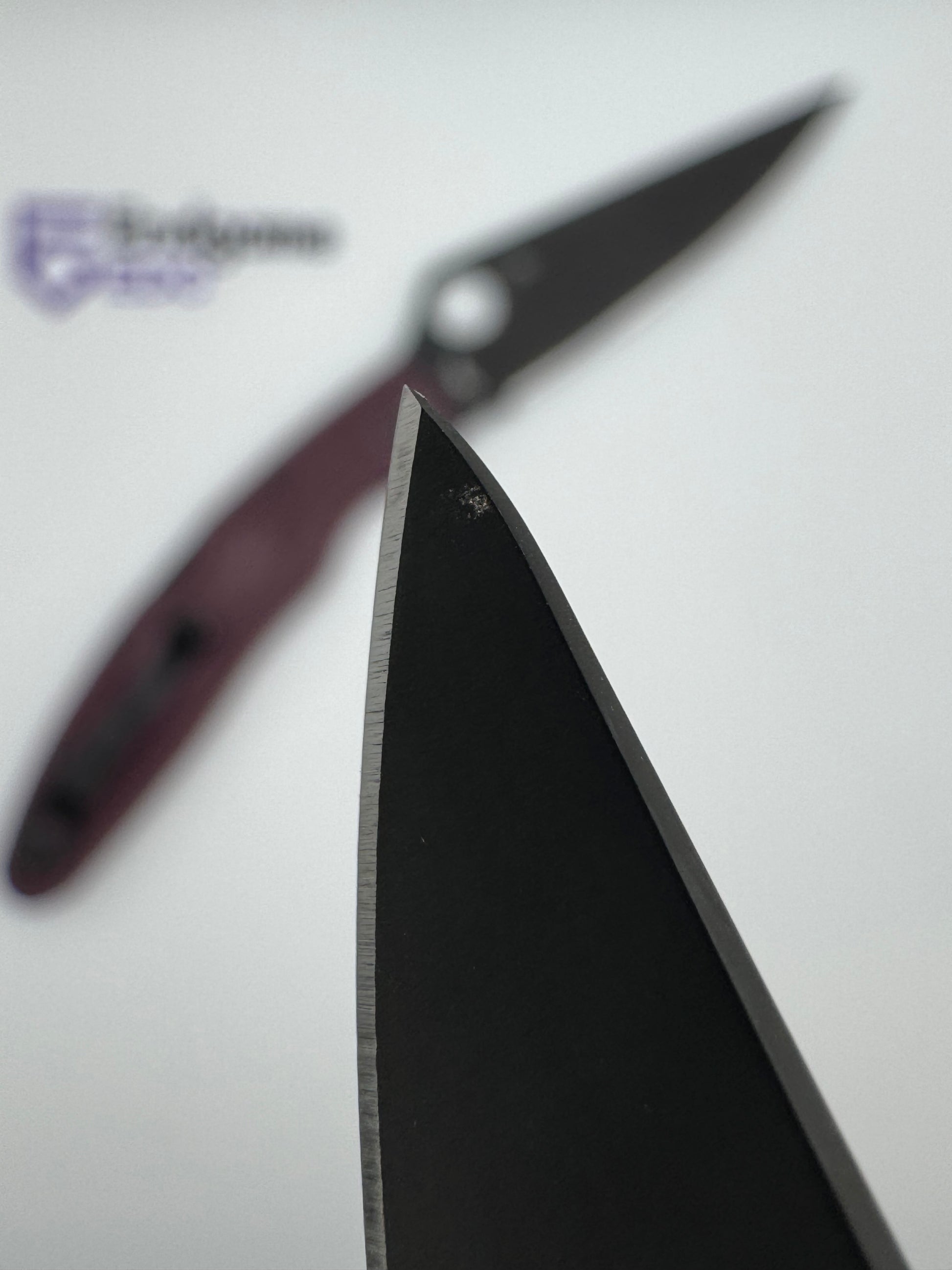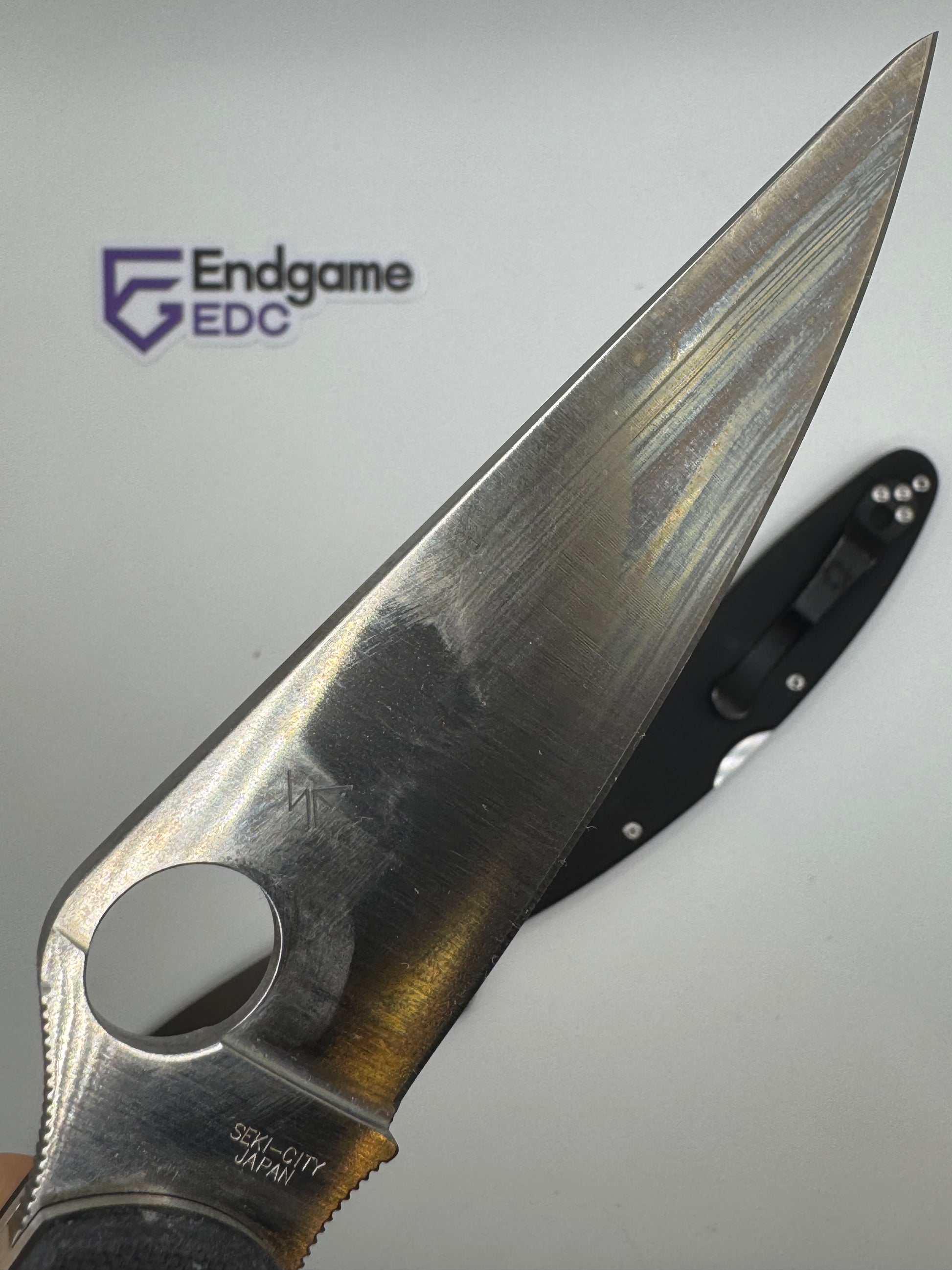 - "sticker shadow" - faint stain of the ID sticker that Spyderco put on the knife. We have done our best to clean each blade, but unfortunately were unable to remove it in some cases.