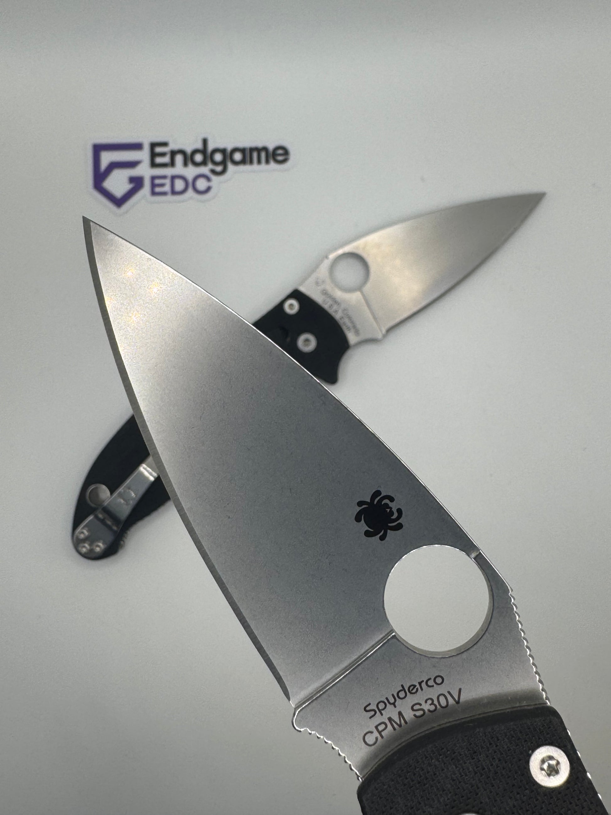 - "sticker shadow" - faint stain of the ID sticker that Spyderco put on the knife. We have done our best to clean each blade, but unfortunately were unable to remove it in some cases.