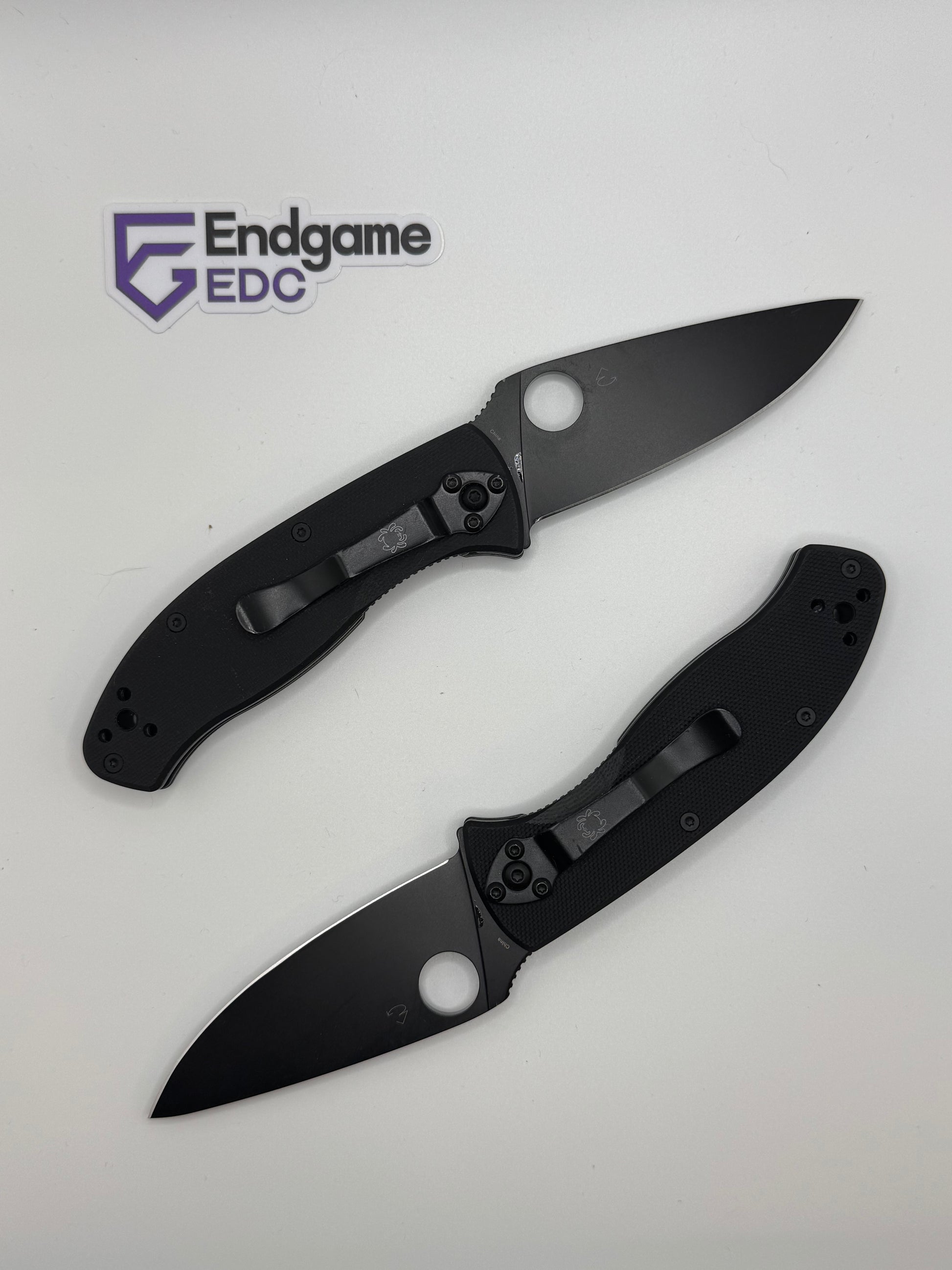 - "sticker shadow" - faint stain of the ID sticker that Spyderco put on the knife. We have done our best to clean each blade, but unfortunately were unable to remove it in some cases.
