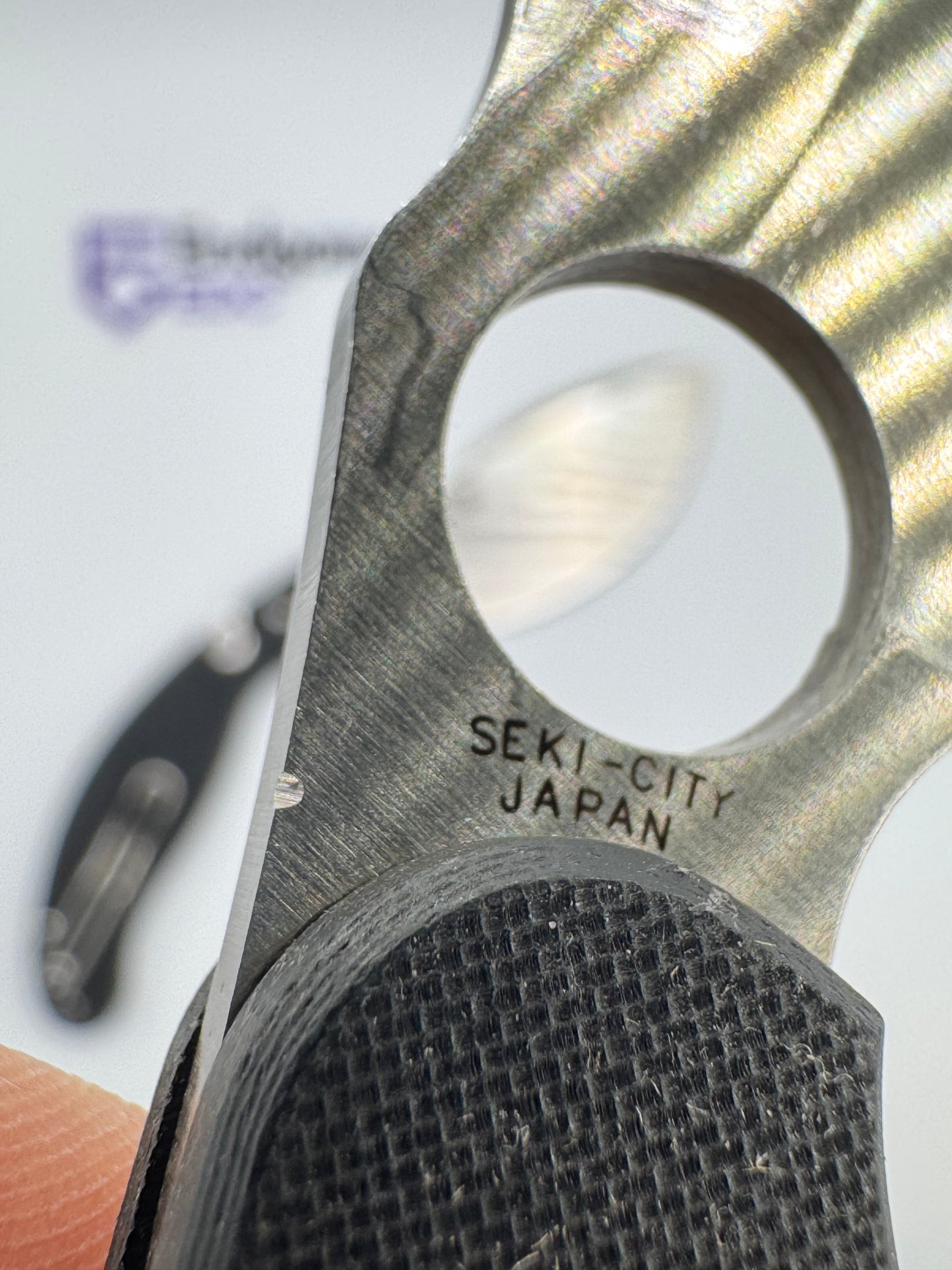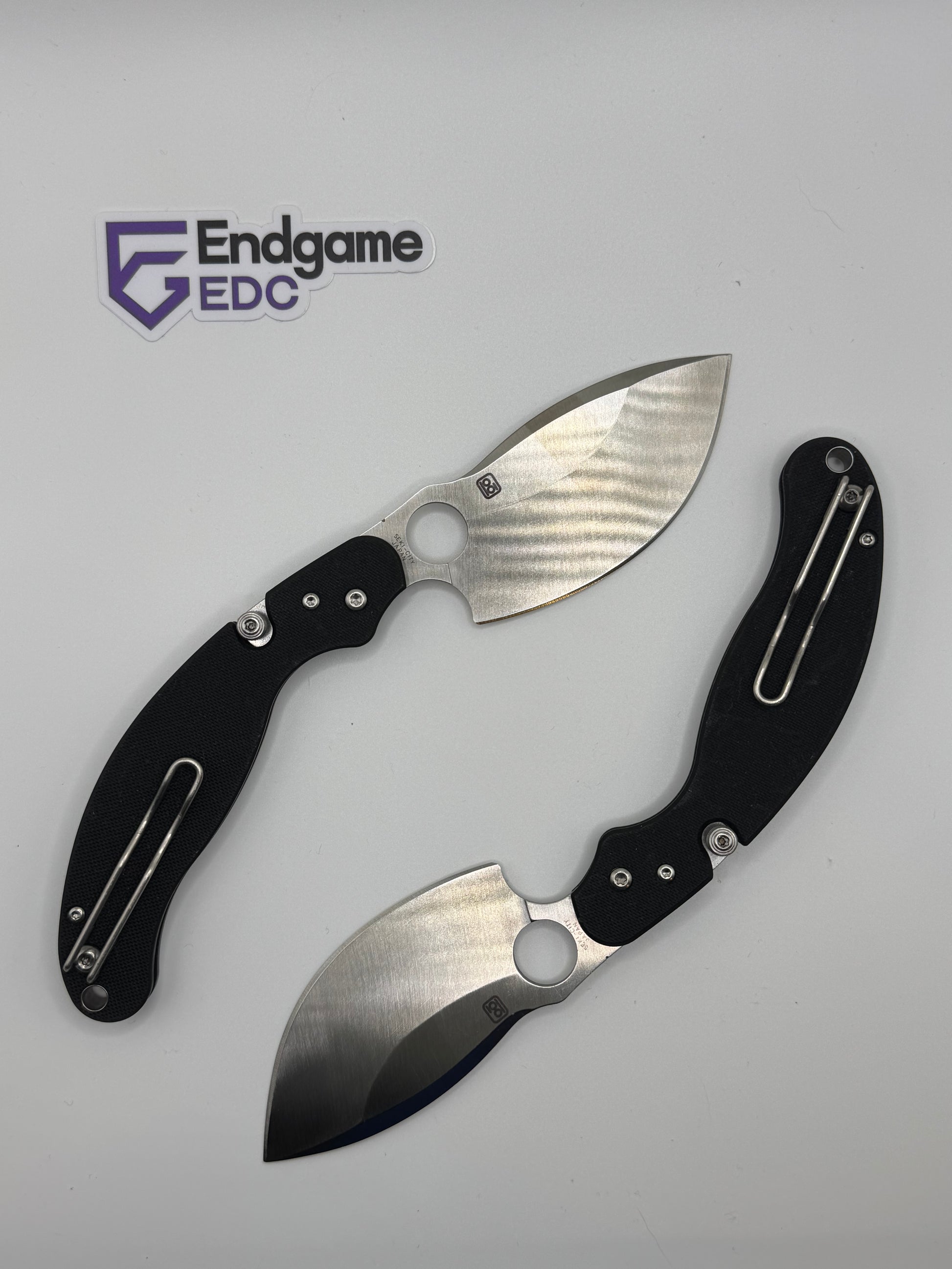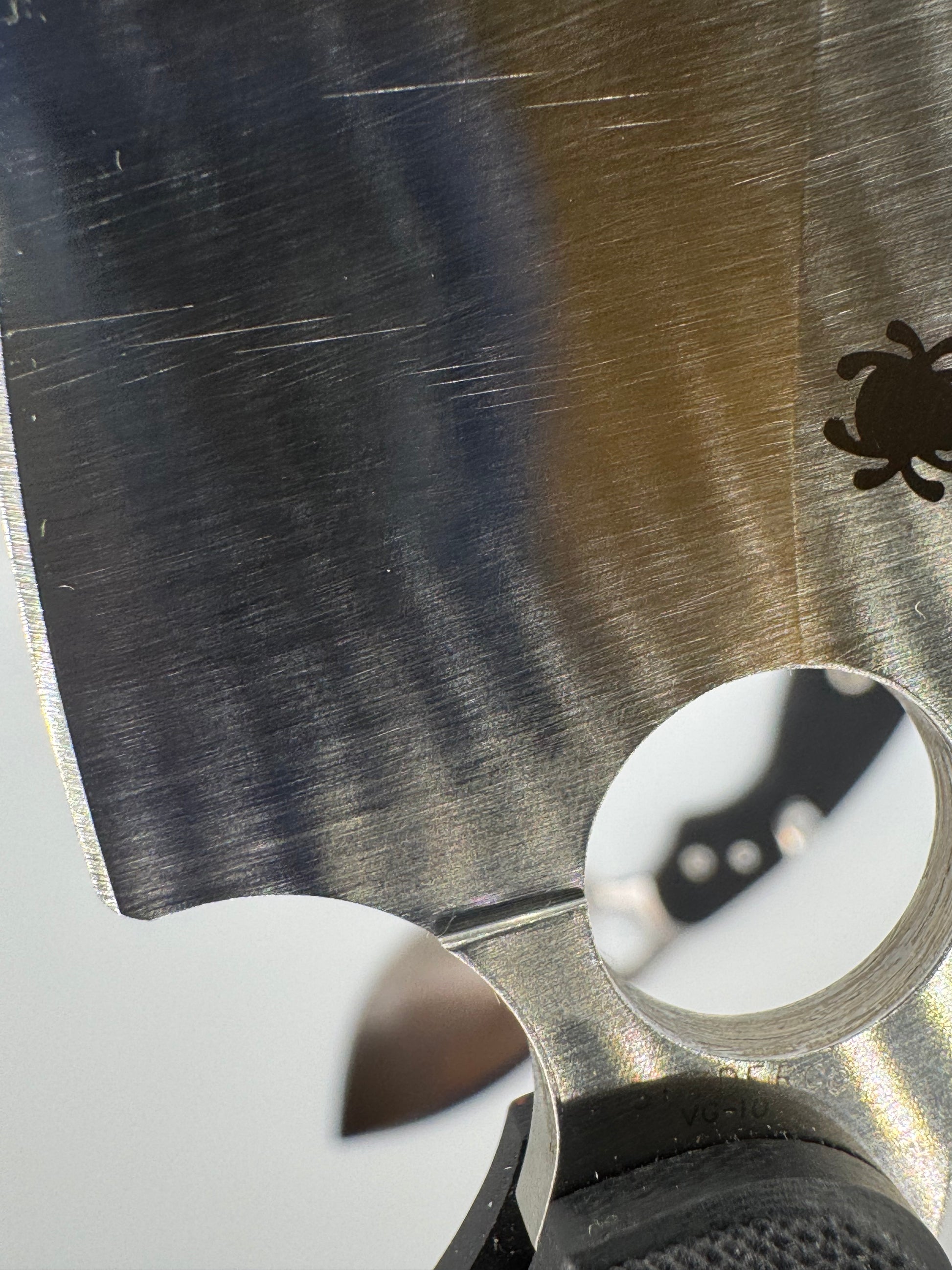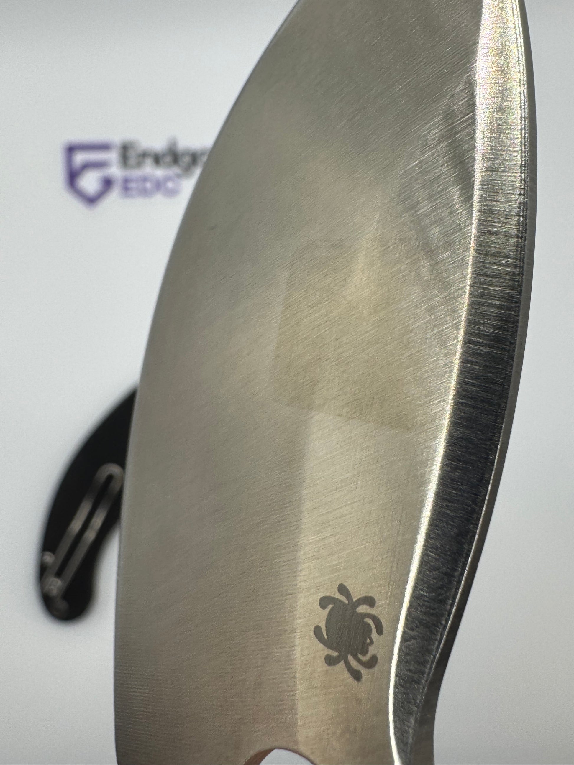 - "sticker shadow" - faint stain of the ID sticker that Spyderco put on the knife. We have done our best to clean each blade, but unfortunately were unable to remove it in some cases.