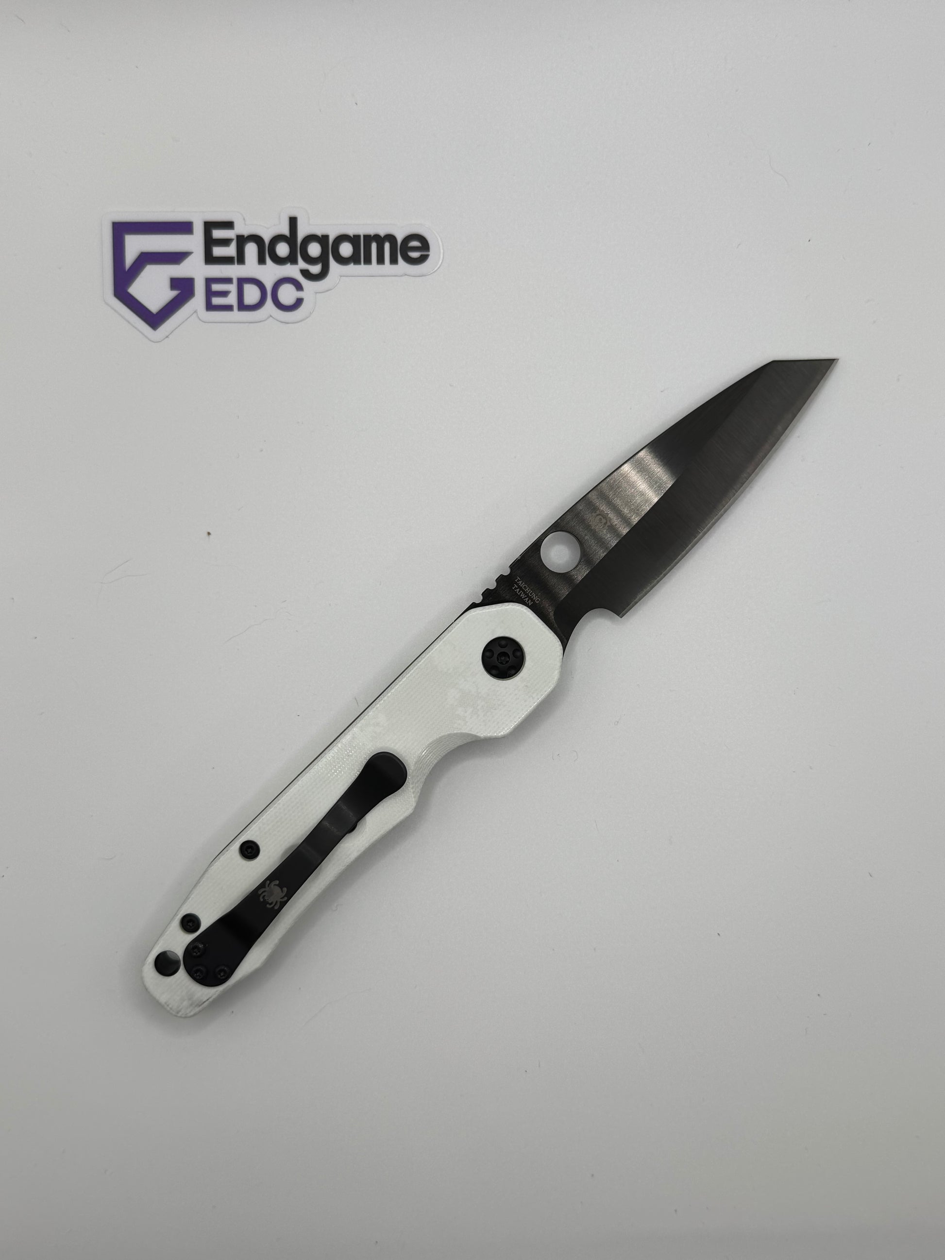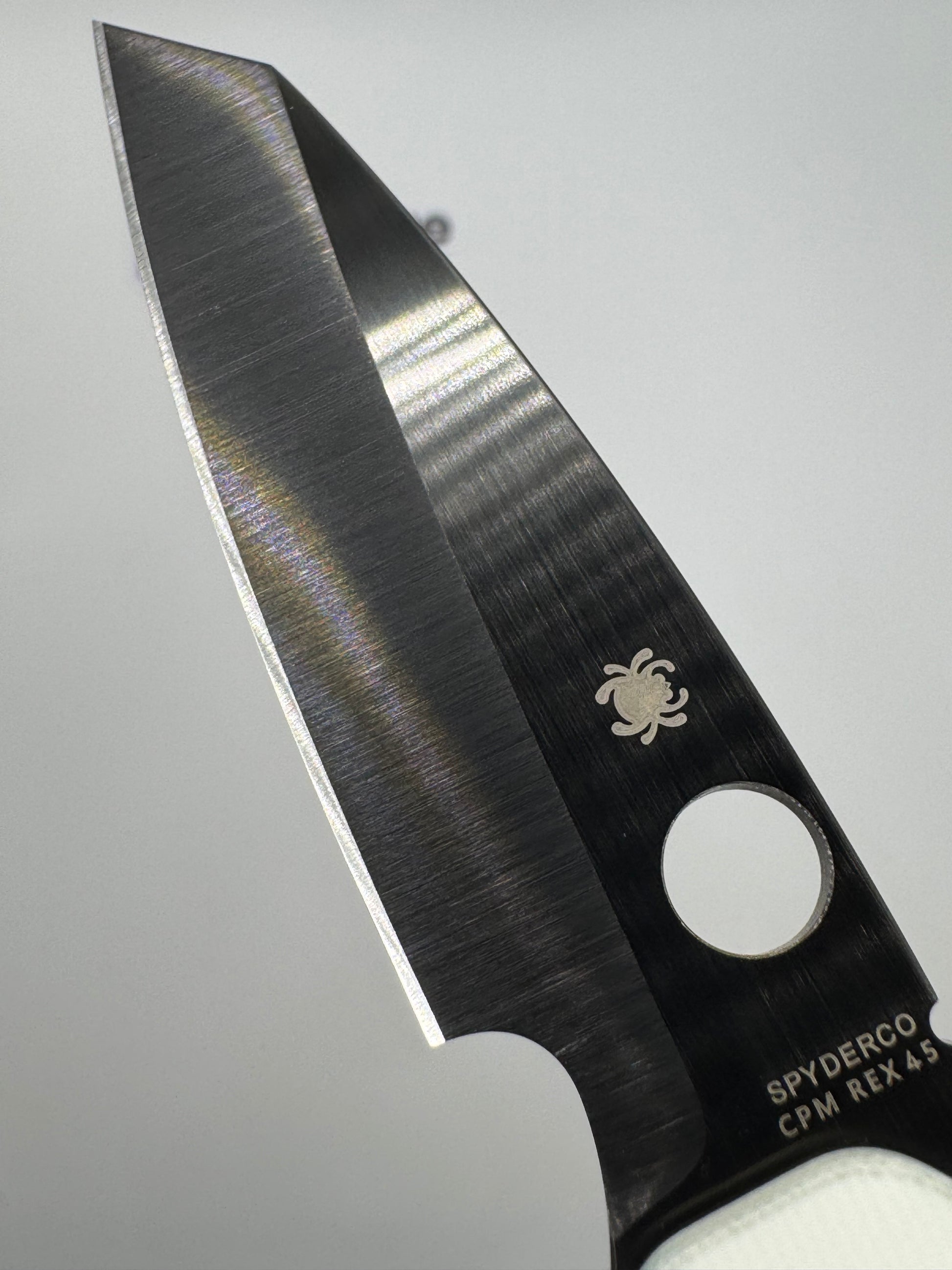 - "sticker shadow" - faint stain of the ID sticker that Spyderco put on the knife. We have done our best to clean each blade, but unfortunately were unable to remove it in some cases.