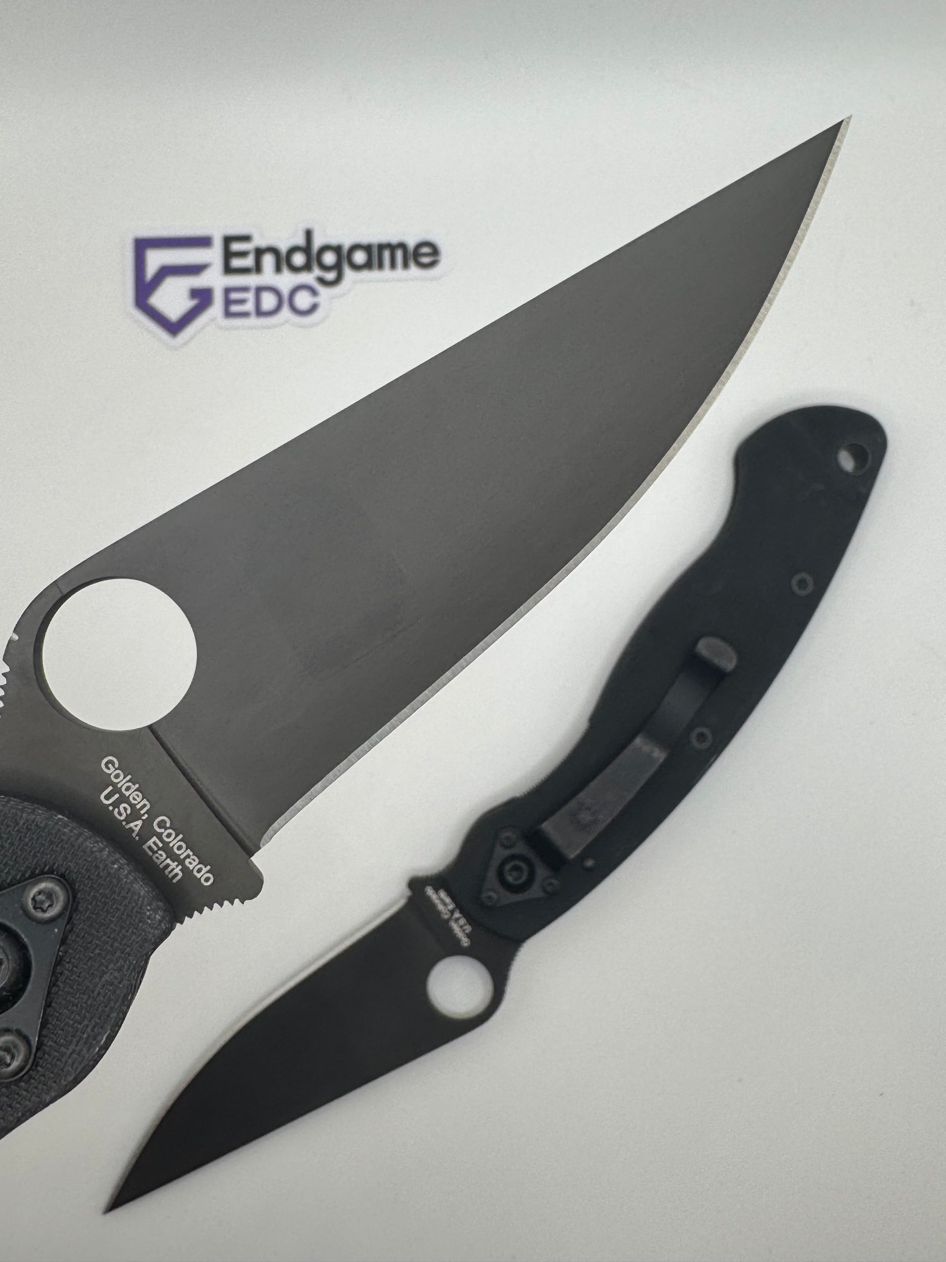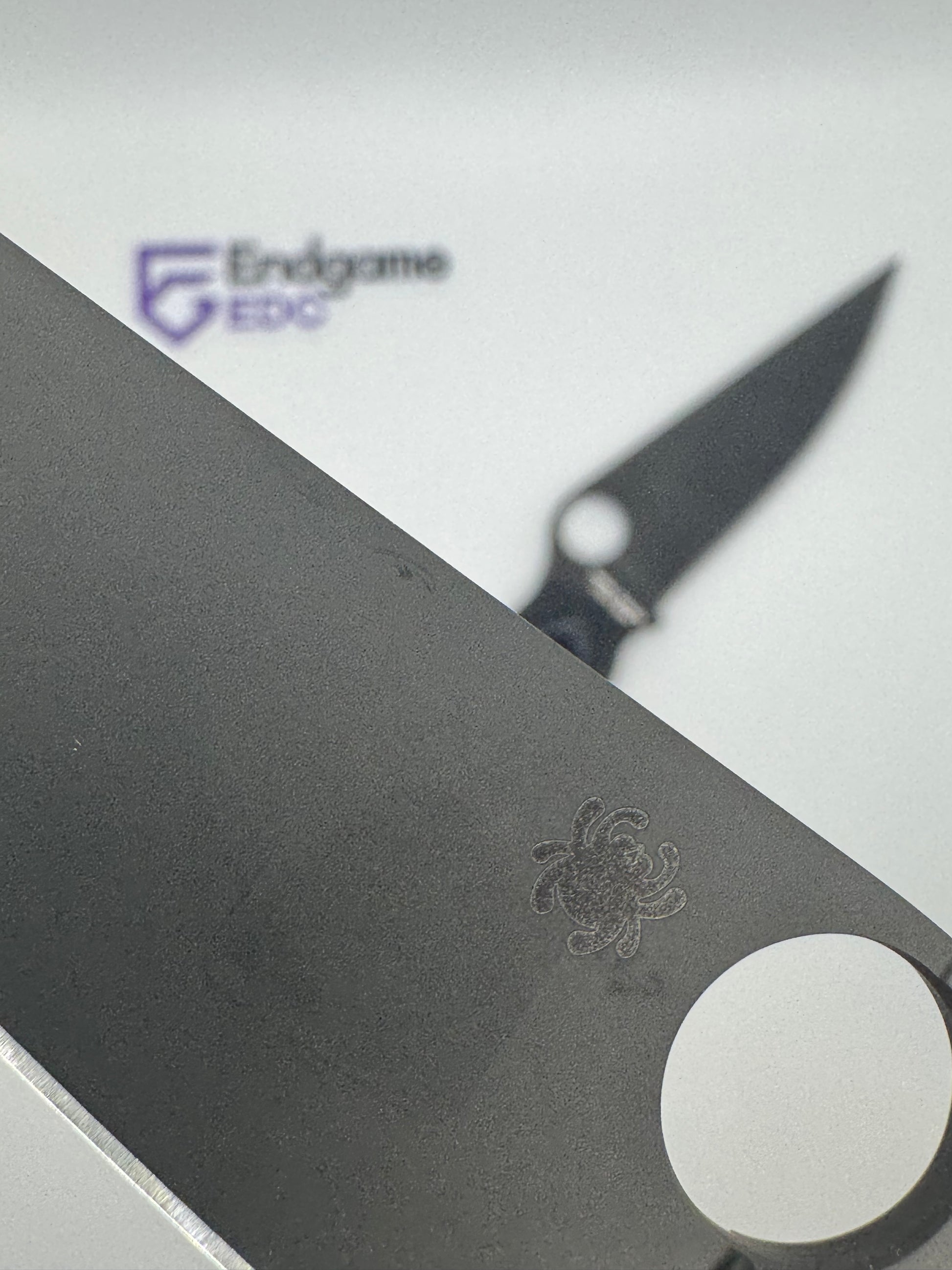 - "sticker shadow" - faint stain of the ID sticker that Spyderco put on the knife. We have done our best to clean each blade, but unfortunately were unable to remove it in some cases.