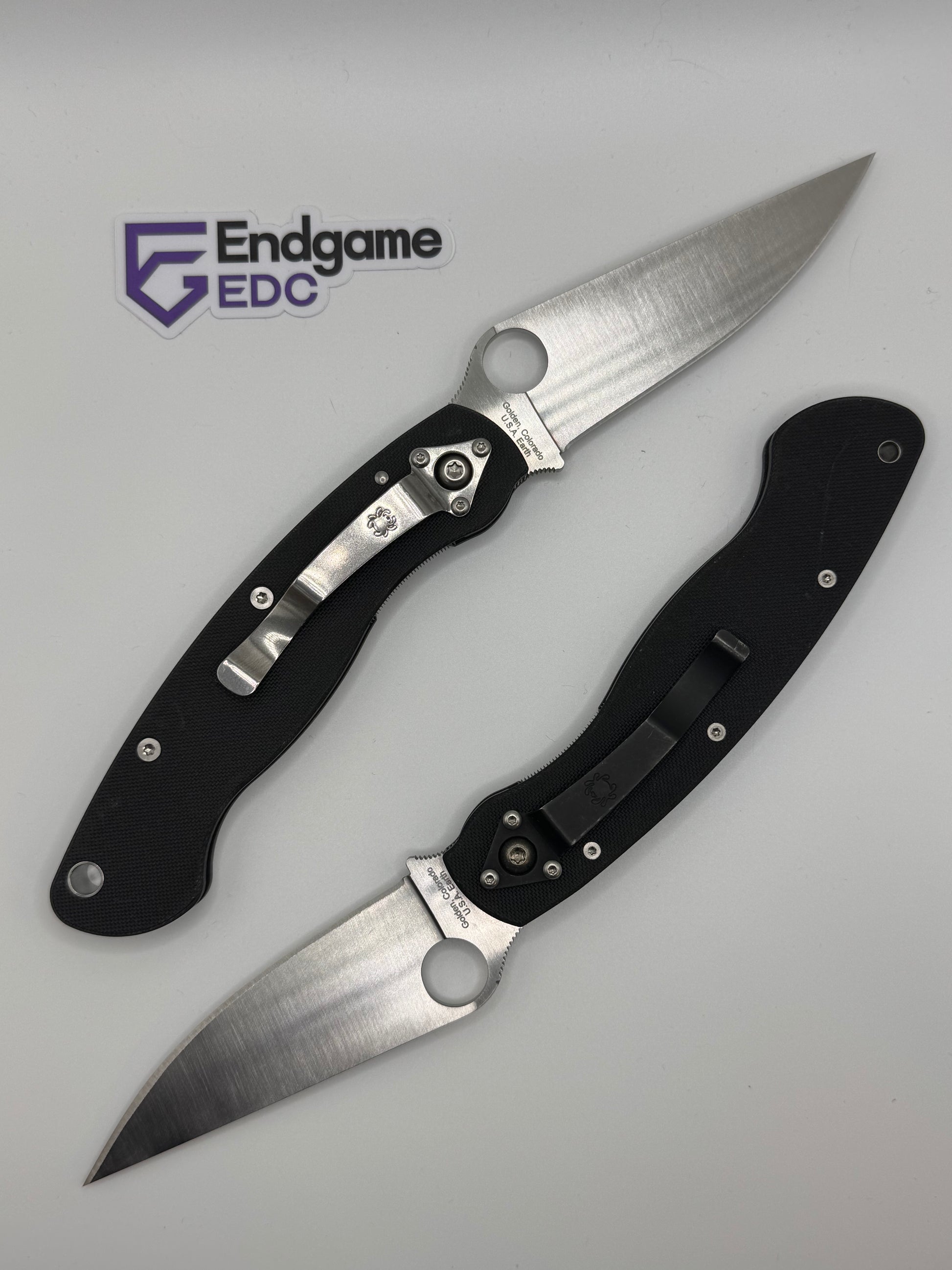 Spyderco co-founder Sal Glesser designed the original Military™ Model to be the perfect cutting tool for forward-deployed military personnel. First introduced in 1996, it has since earned a reputation as one of the most iconic folding knife designs ever produced. The current Military Model is available in several different configurations, all featuring full-flat-ground blades crafted from CPM® S30V® stainless steel. The PlainEdge™ blades of these models proudly feature a fully accessible Trademark Round Hole™ for swift, ambidextrous, one-handed deployment and are available with either a satin finish or a non-reflective Diamond-Like Carbon (DLC) coating. Their handles are constructed with either black or digital camouflage G-10 scales. The peel-ply-textured scales house nested stainless steel liners that form the foundation of a sturdy LinerLock mechanism and anchor a right-side, tip-down pocket clip. The easy to clean, open-backed handle design keeps the knives exceptionally lightweight and also features a generously sized lined lanyard hole for the easy attachment of lanyards and security lines. For left-handed users, the basic satin-finished, black-handled version of the Military is also available in a mirror-image, left-handed configuration with a pocket clip that provides left-side, tip-down carry.
