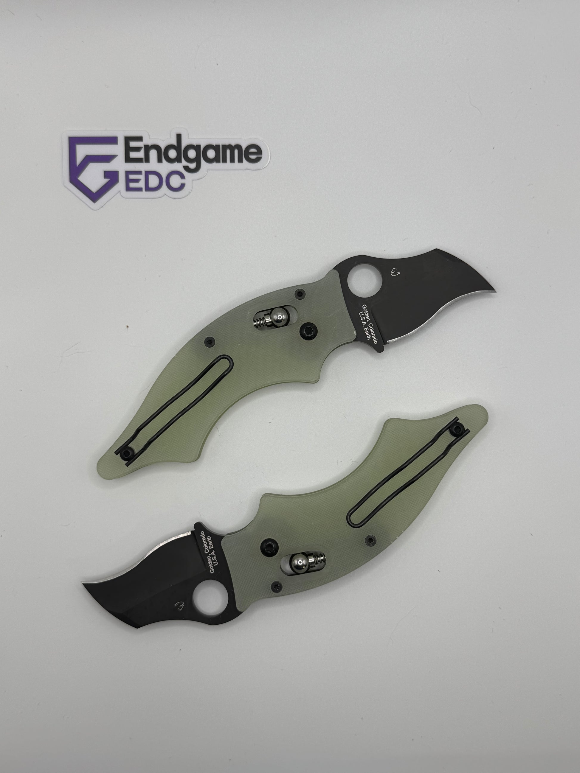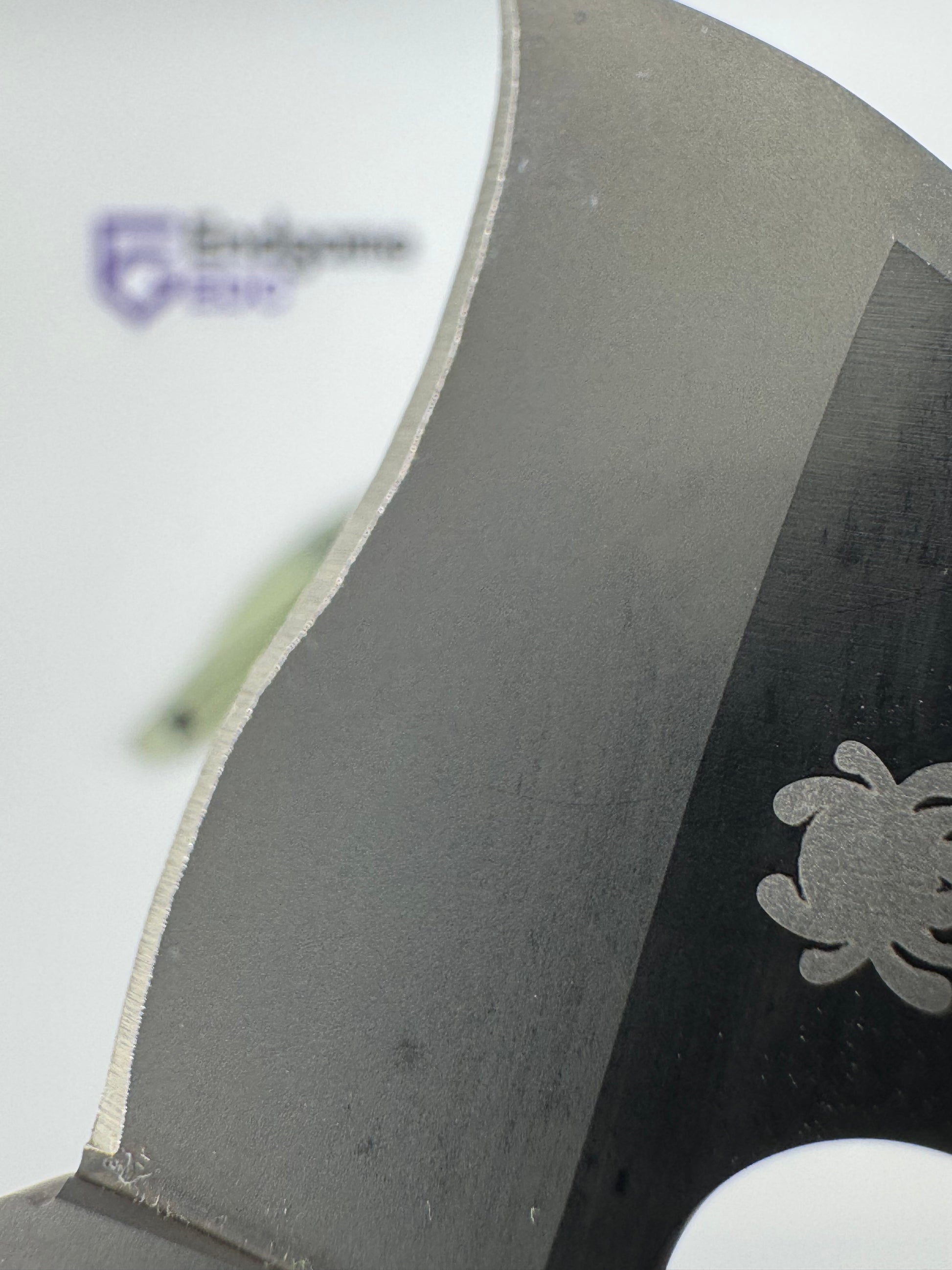 - "sticker shadow" - faint stain of the ID sticker that Spyderco put on the knife. We have done our best to clean each blade, but unfortunately were unable to remove it in some cases.