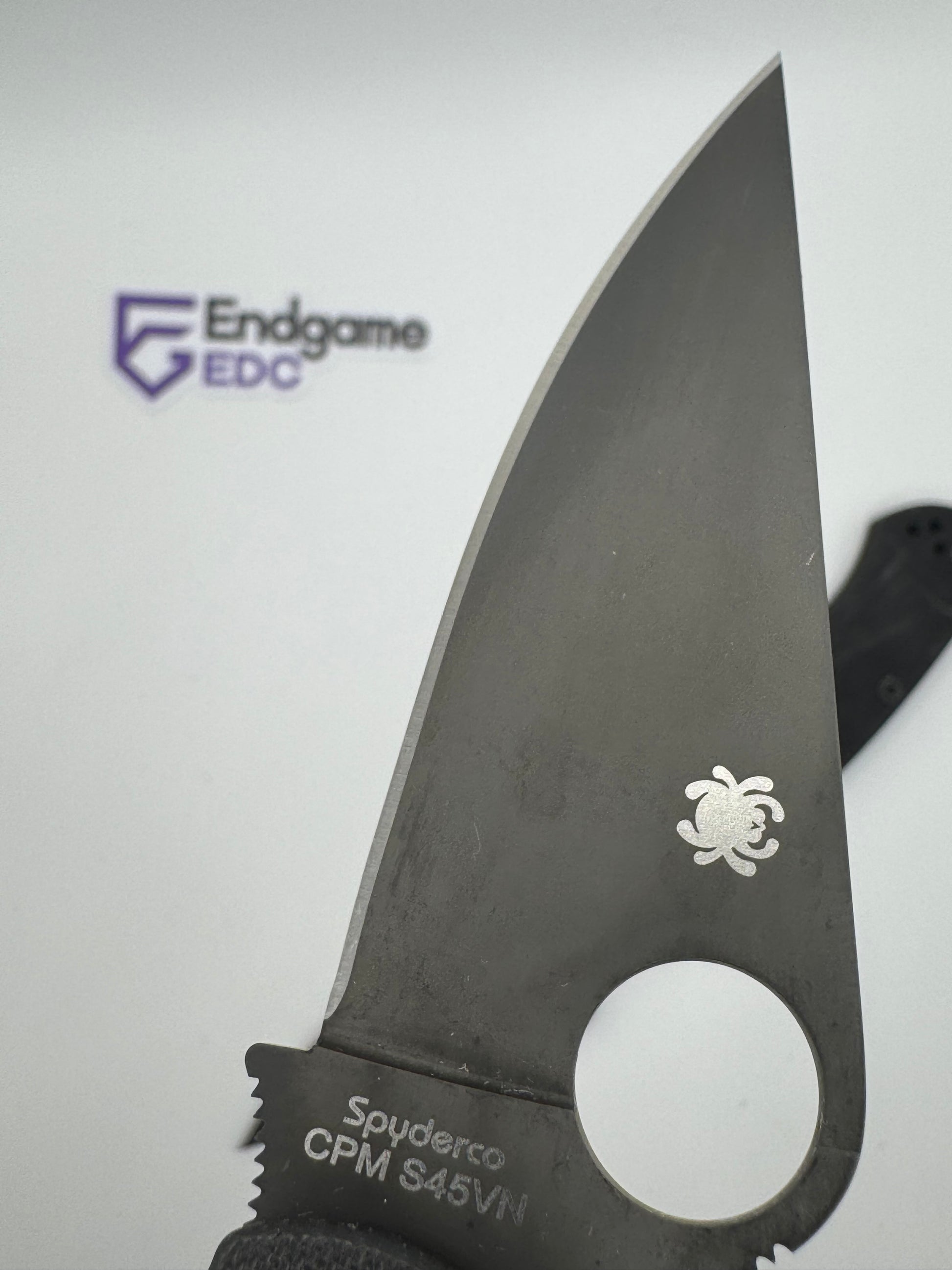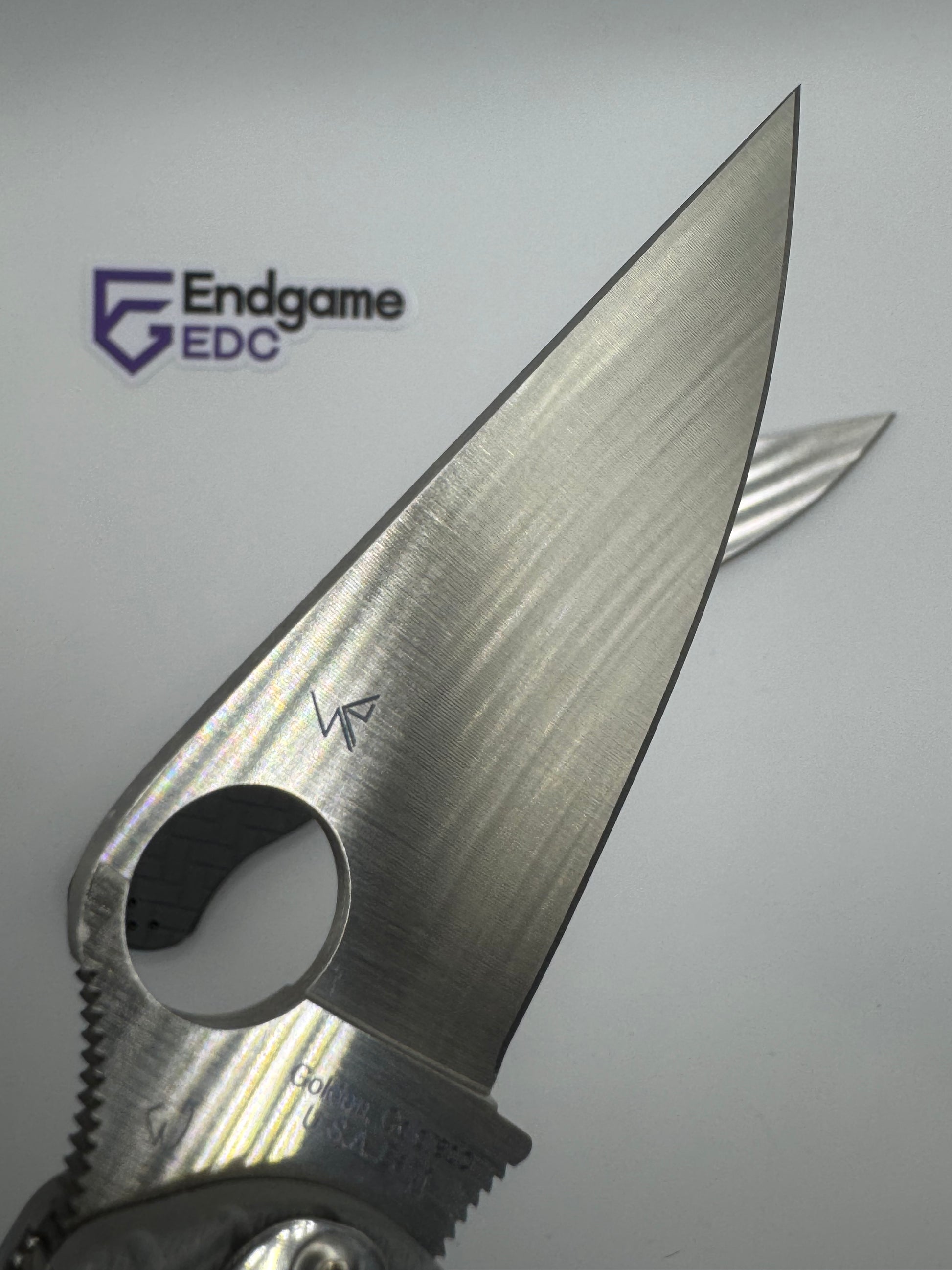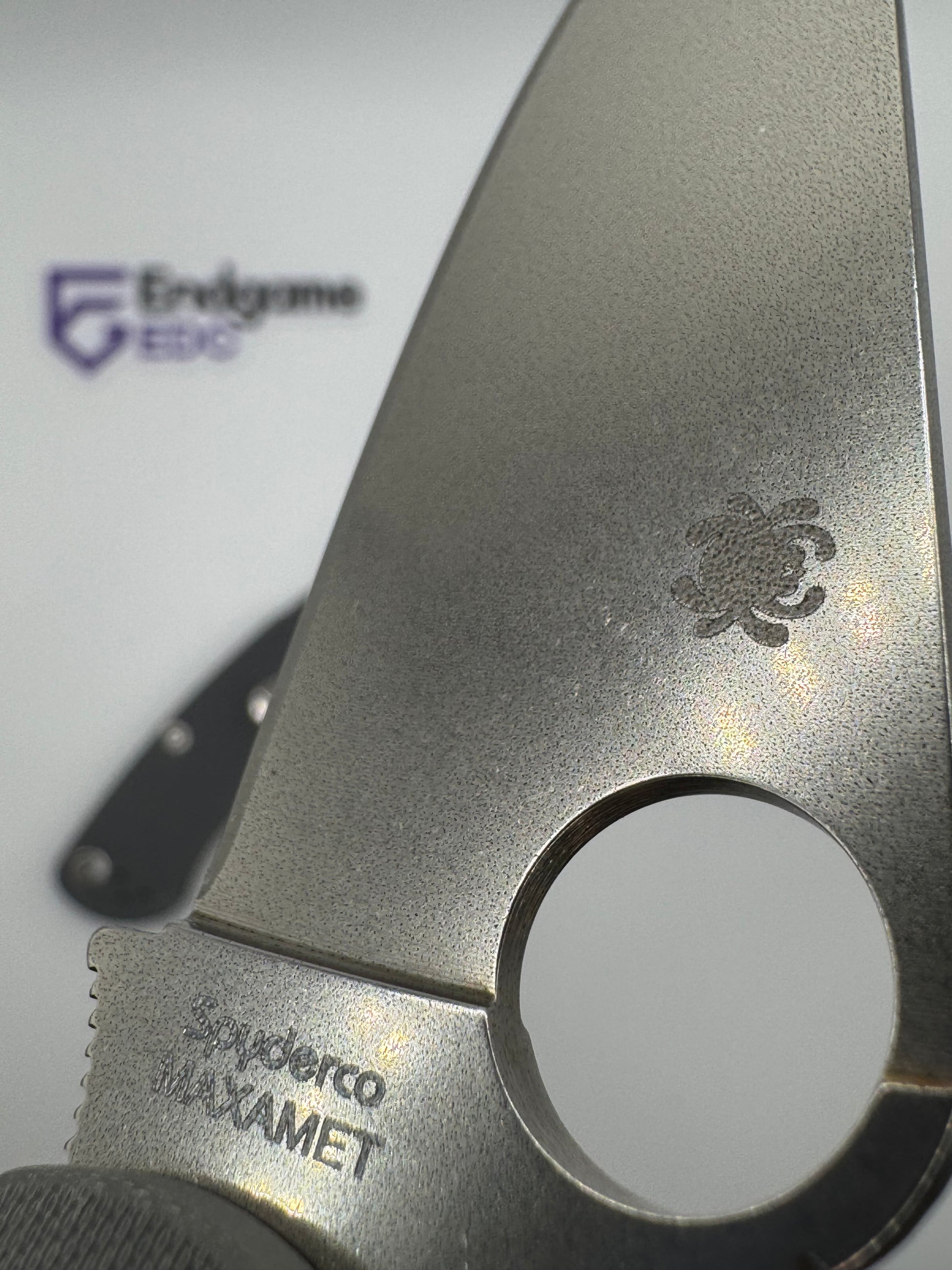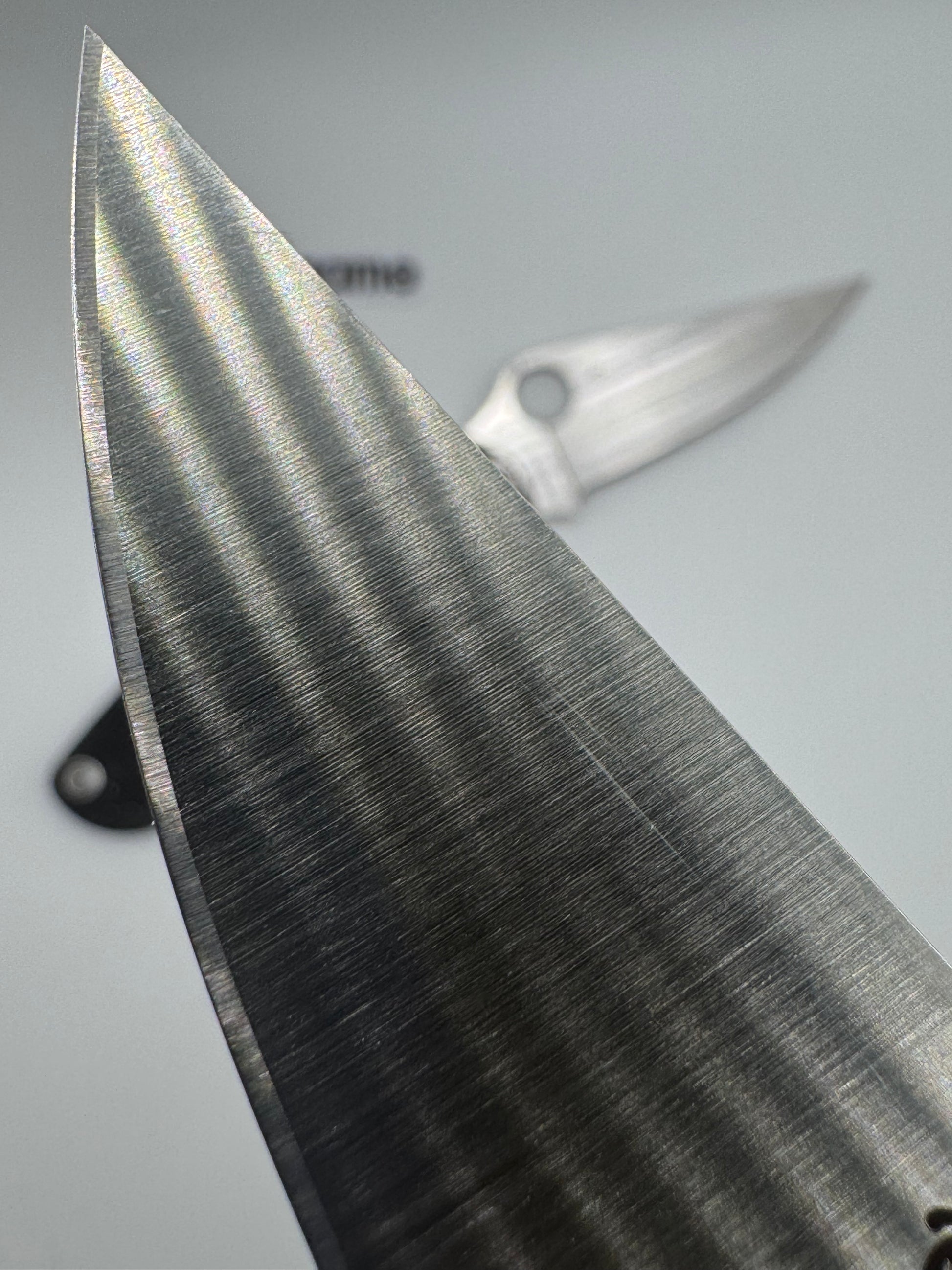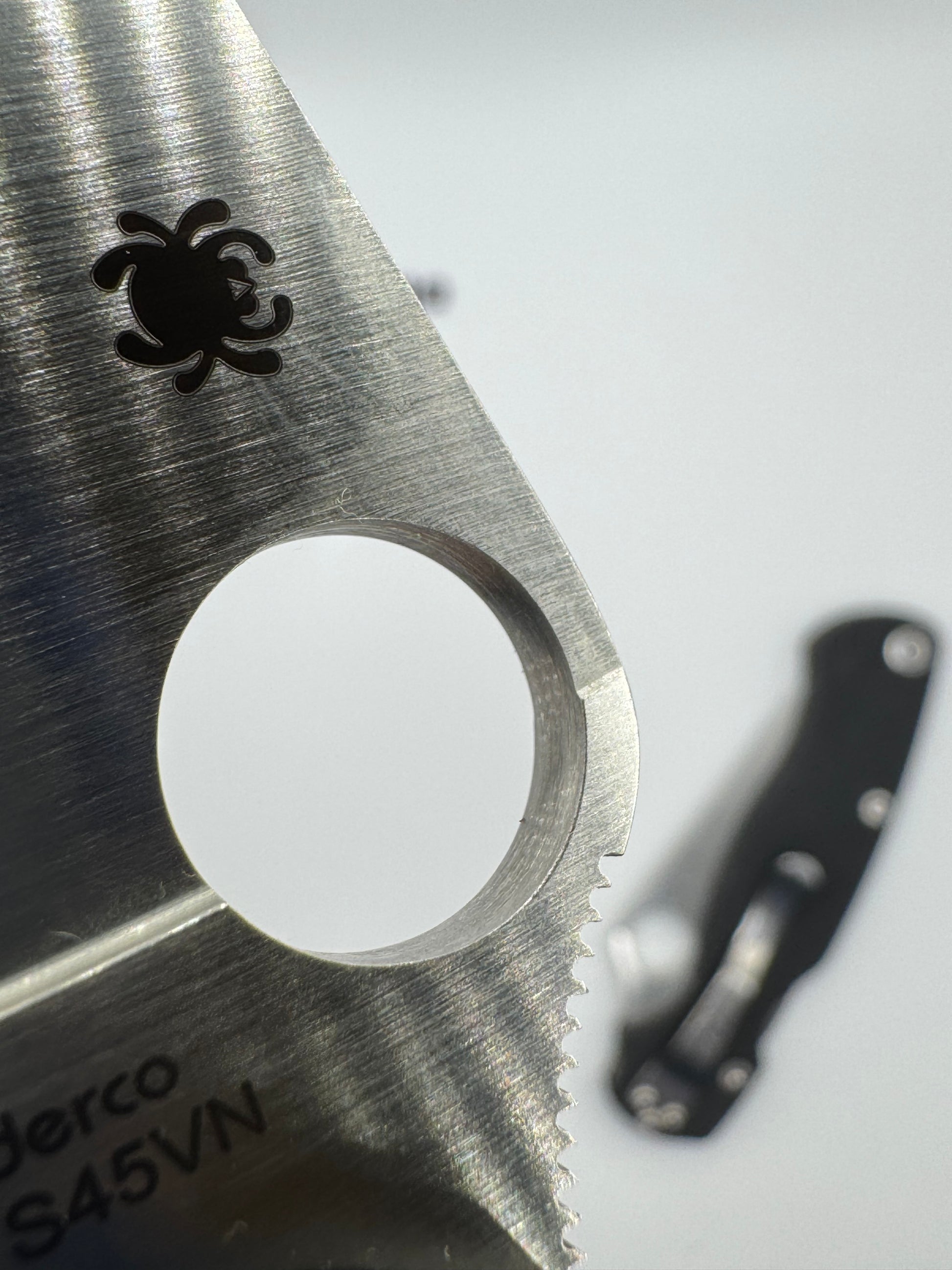 - "sticker shadow" - faint stain of the ID sticker that Spyderco put on the knife. We have done our best to clean each blade, but unfortunately were unable to remove it in some cases.