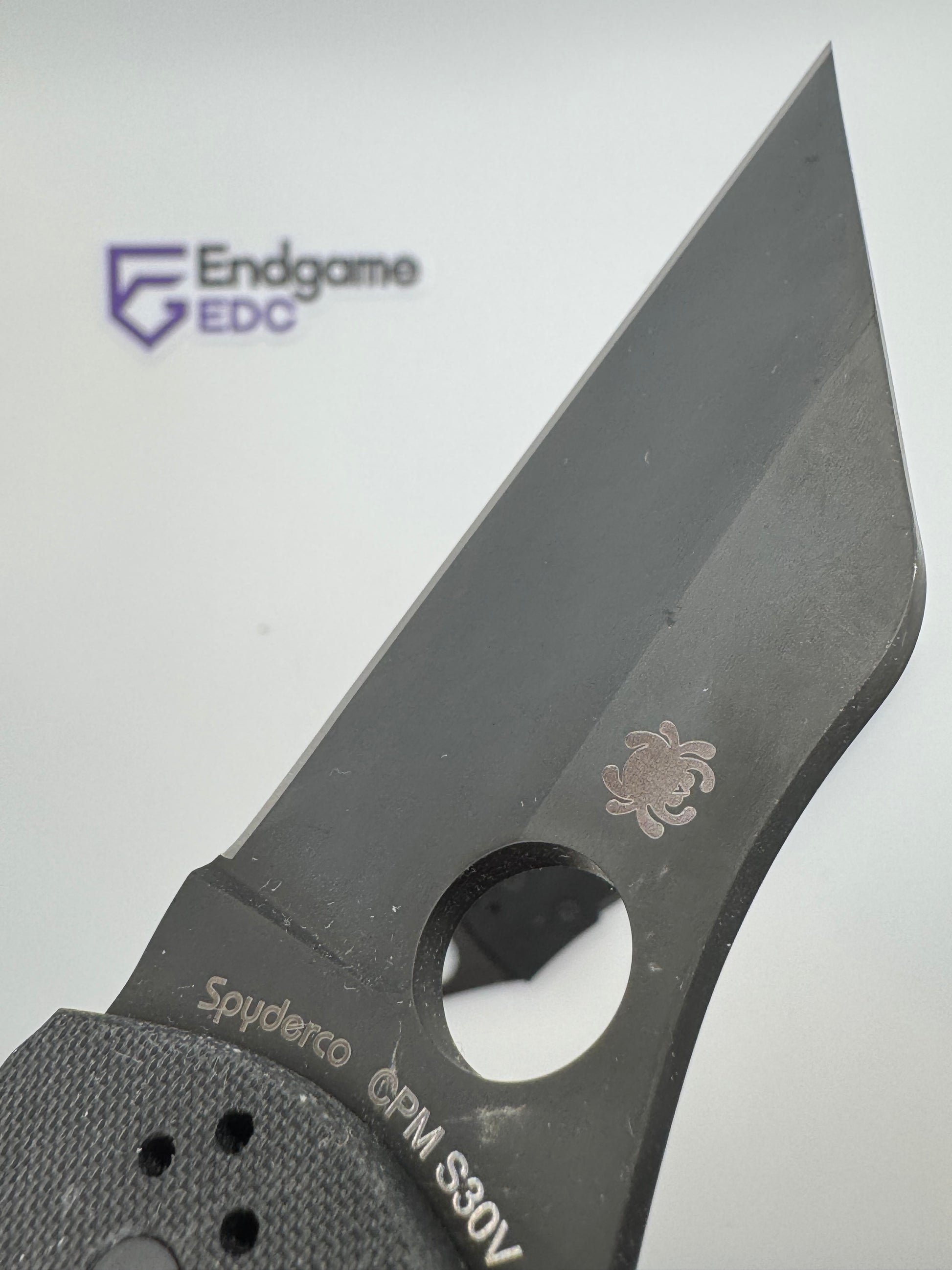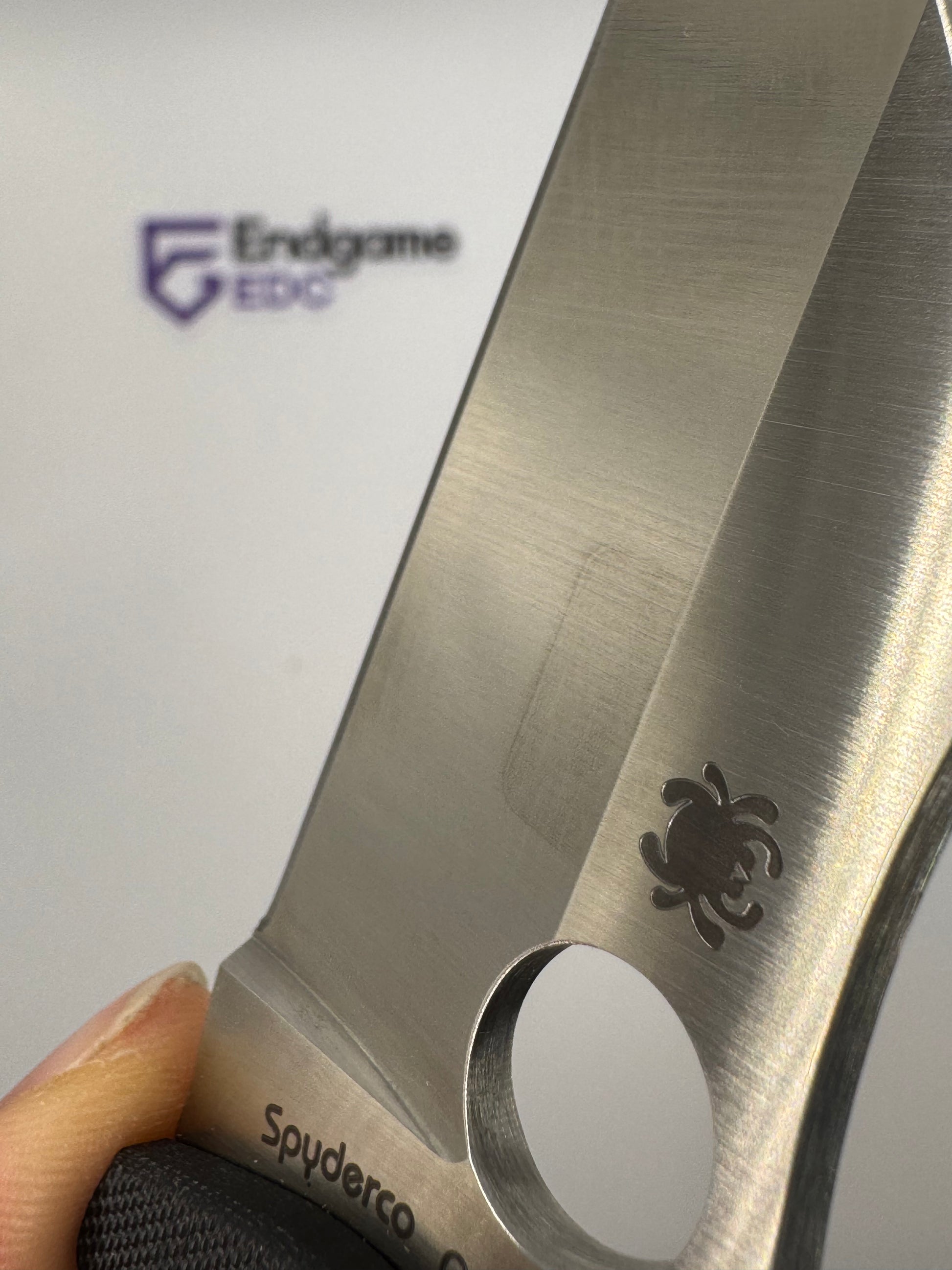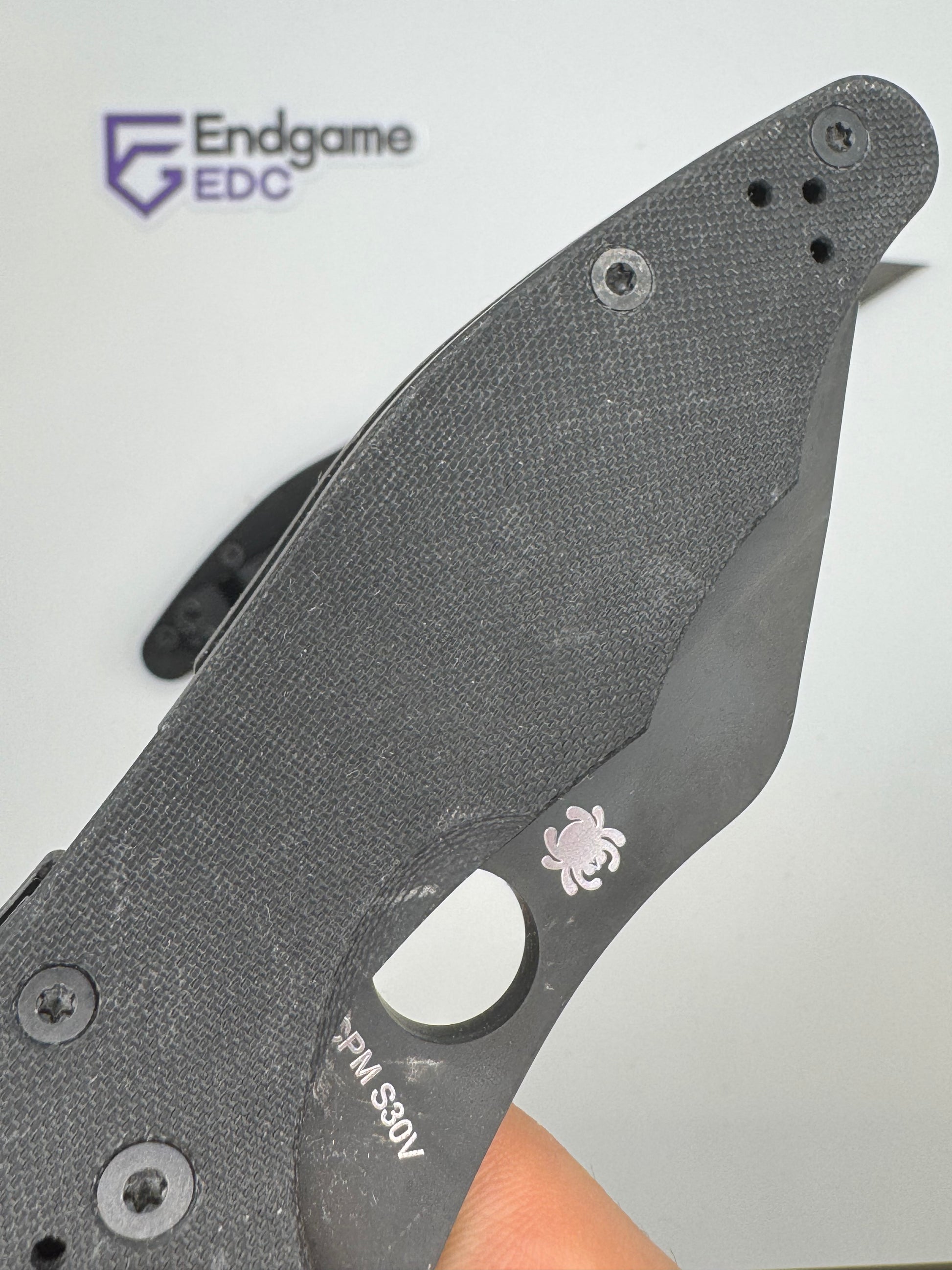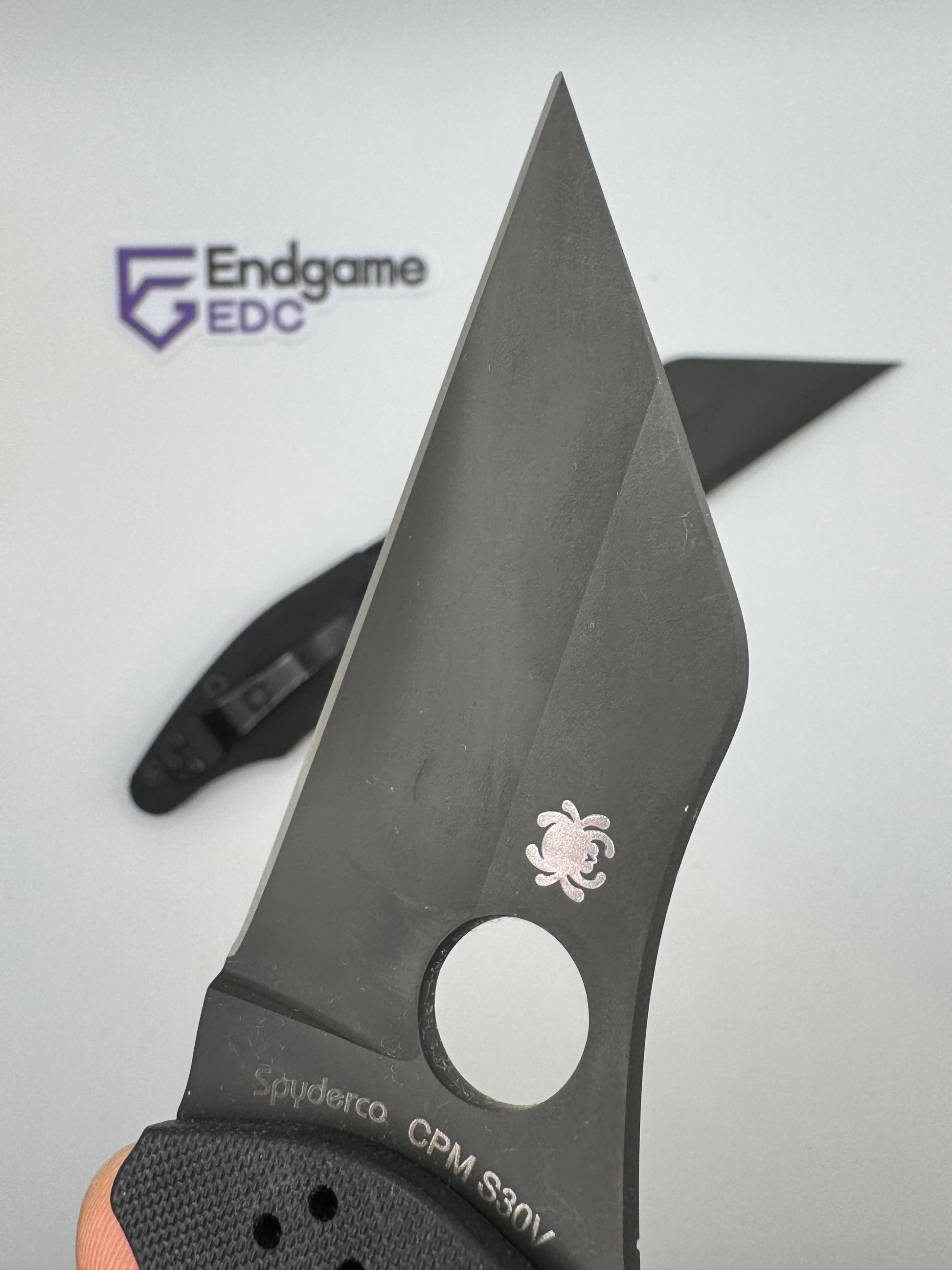 - "sticker shadow" - faint stain of the ID sticker that Spyderco put on the knife. We have done our best to clean each blade, but unfortunately were unable to remove it in some cases.