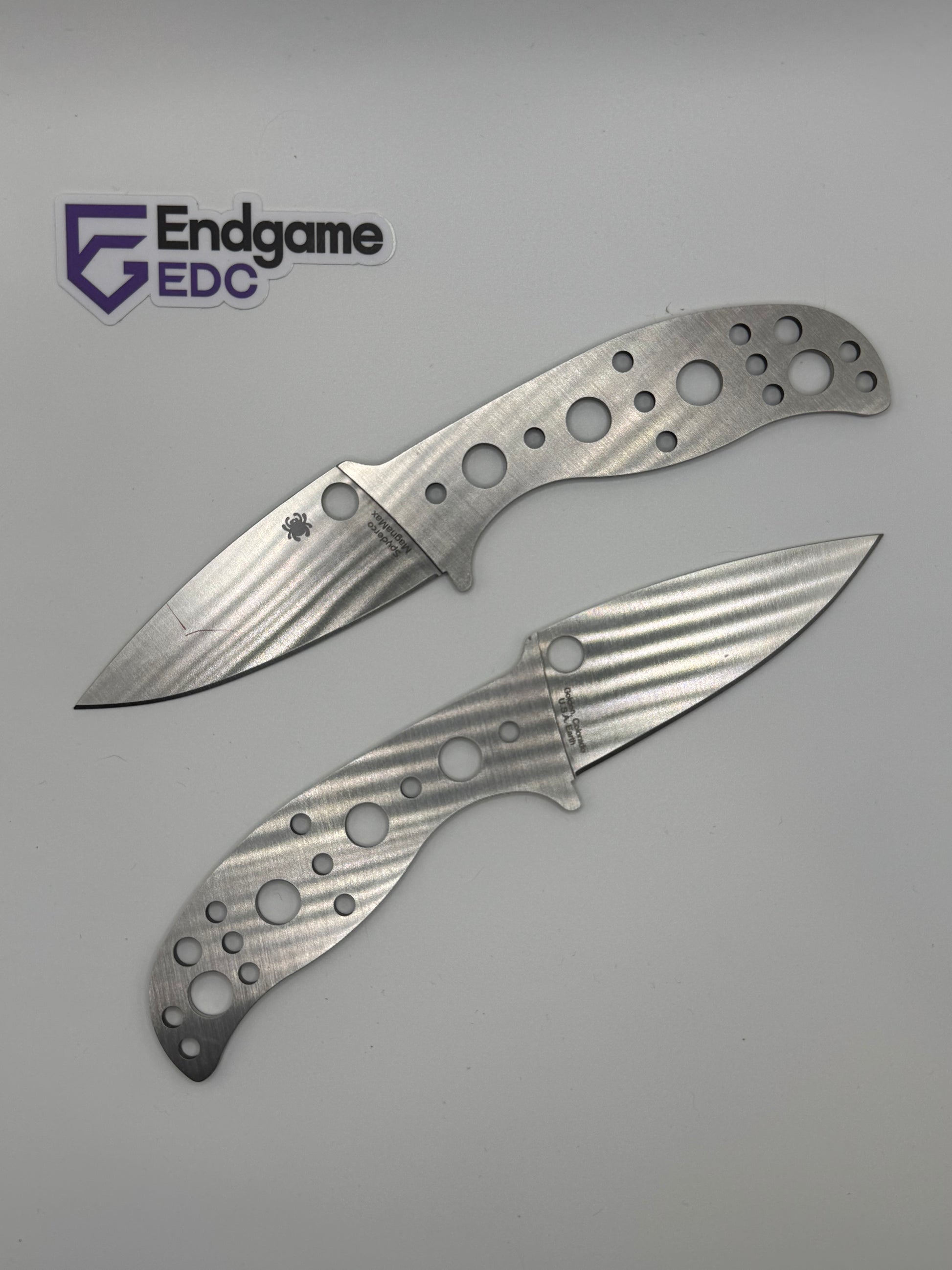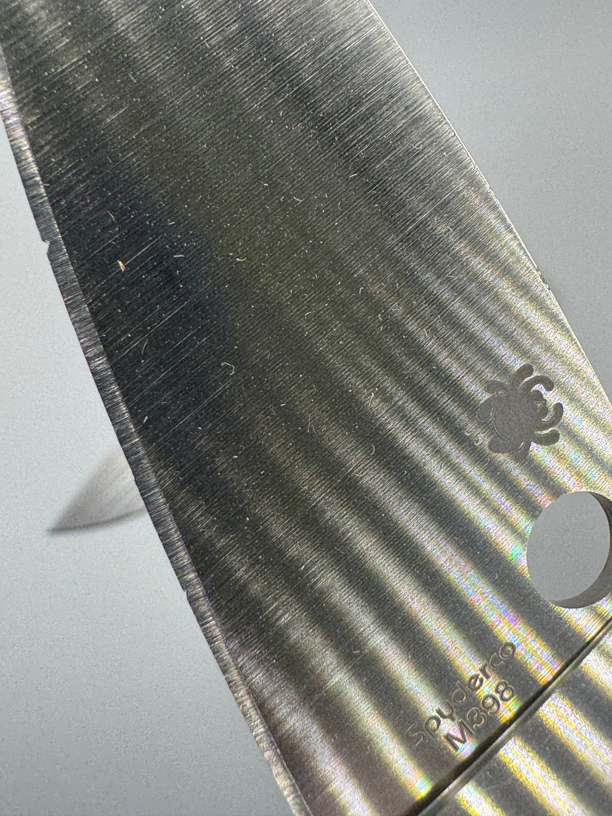 We also got a few M398 mules for those who wanted another extreme performance stainless steel. It's another relatively newish alloy in the knife world and seems to be a relative of the popular M390, also from Bohler-Uddeholm. Spyderco did a run of these M398 mules to test their ability to work with M398 in the USA, but we believe their full attempt to made a folding knife with M398 failed and thus it's not likely that we'd see them use it again outside of their Italian-OEM'd models.