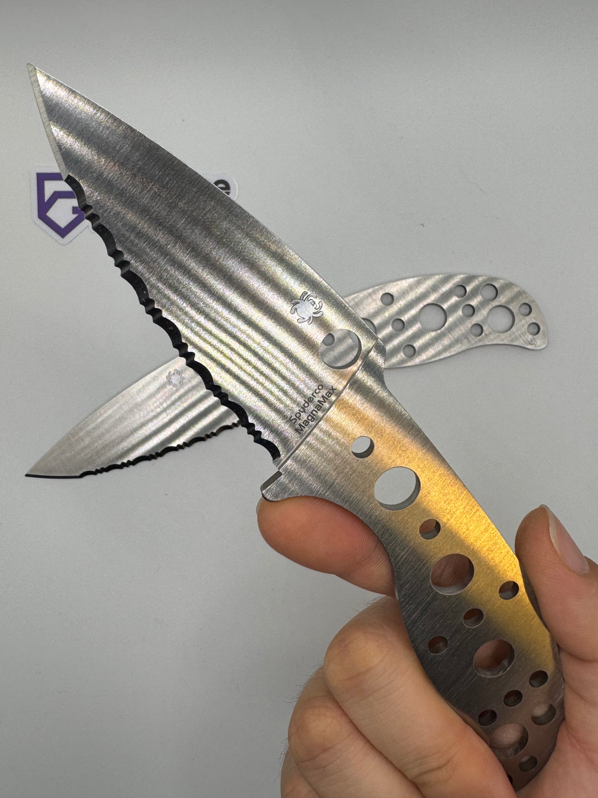- "sticker shadow" - faint stain of the ID sticker that Spyderco put on the knife. We have done our best to clean each blade, but unfortunately were unable to remove it in some cases.
